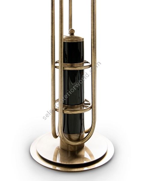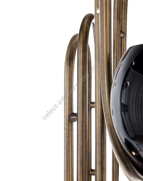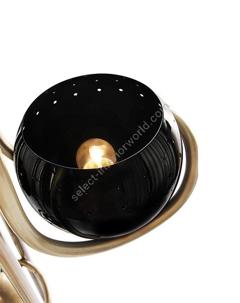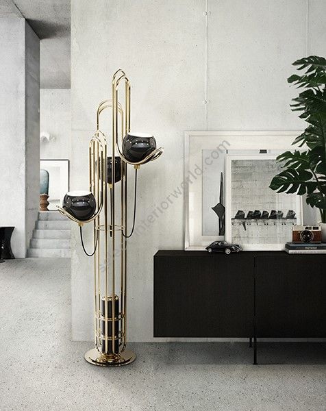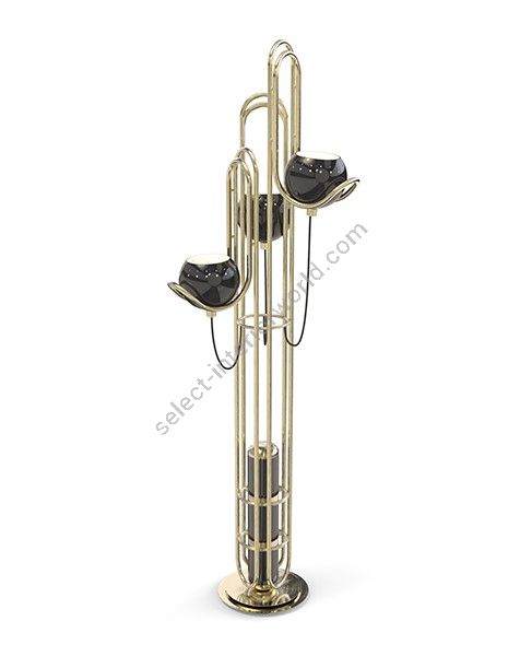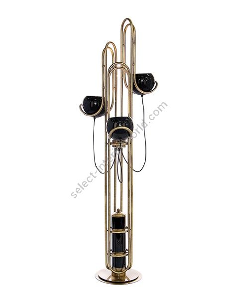 Neil floor lamp is a reminiscent lamp of the golden years of space. Around, brass base secures a black matte stem reaching up into three glossy black finished lampshades with a futuristic style. The three arms with flexible lights provide a good peripheric light range. The elegance of the continuous flowing center tubes gives a floating sensation to the whole piece, that would be perfect in a retro style living room next to a lounge chair or in a luxurious lobby. The gold plated body is the ultimate detail in this retro floor lamp. Handmade in brass tubing using a classic method of bending the brass twice into a rounded oblong shape that allows for bright and load casts of light holding spherical diffusers with a retro design.