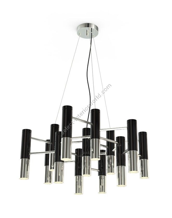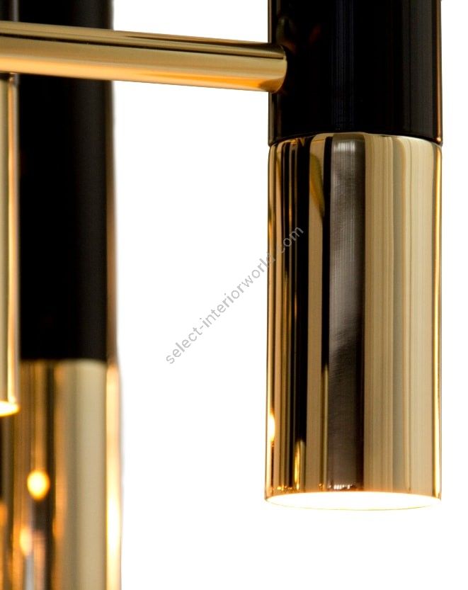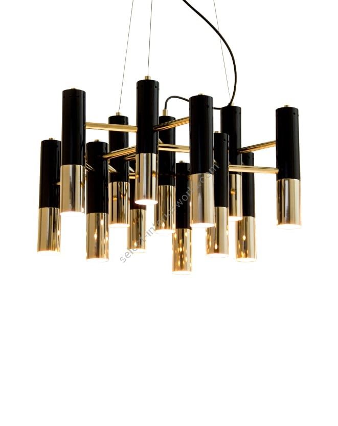 Ike suspension lamp has a distinctive but easily recognizable design, ideal for every single mid-century modern interior. With its clean lines, this dazzling lamp is handmade in brass and aluminum and features a glossy black and gold plated finish, representing a high-quality craftsmanship. It is 15 inches tall, but its steel cord can be customizable on purchase, being flexible up to 39.4 inches. Highly recommended to use with a dimmer switch to cast a smoother light, this modern brass lamp is perfect as a dining room chandelier lighting or to be used in a hotel lobby.