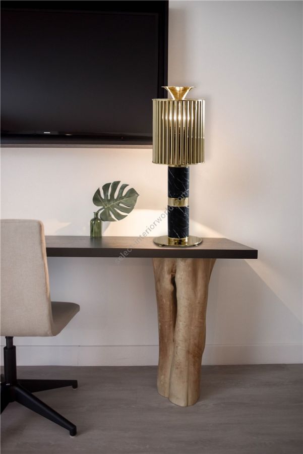 A majestic tall table lamp, Donna has come to redefine everything we have ever seen in the lighting design world. Almost 28 inches high, this brass desk lamp is much more than that. Handmade in brass and Estremoz marble, both the body and the shade received a gold-plated finish in order to emphasize its luxurious characteristics. Probably DelightFULL’s most exclusive design, this gold desk lamp features elegant handmade details all around the shade, giving it a Hollywood glamorous feeling. With an exquisite design, it suits any classic entryway or dining room. It is also the perfect table lamp for living room environments.