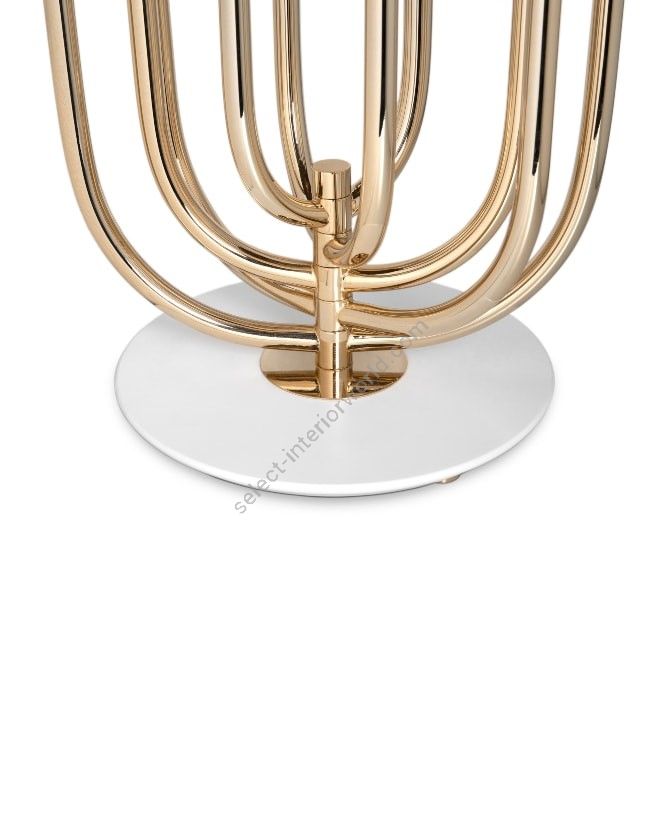 Turner art deco table lamp was inspired by the electrifying and memorable dance moves of the iconic pop singer. Turner is a large table lamp handmade in brass and aluminum. The body has a gold plated finish, while the shade was lacquered a black matte on the outside and a gold powder paint on the inside, so as not to create an uncomfortable glaze for the user. Its five movable arcs can be rotated into the desired position, which gives this black table lamp a sense of fun, and allows you to create the best composition to fit your modern home decor. A versatile piece, that can be used in almost any room of your house, this brass desk lamp looks its best when placed in a modern home office or art deco inspired living room.