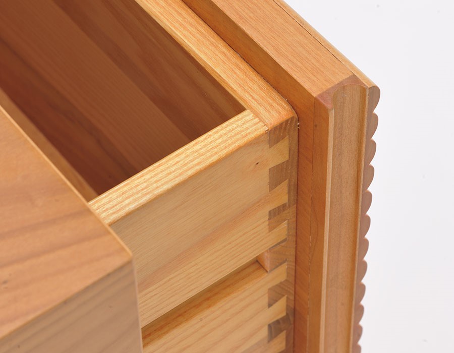 Proposal for Zero composition consists of 1 cherry wood base element with 3 drawers, 3 cabinet elements with glass hinged doors.