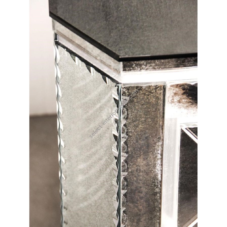 Top made of medium antique mirrored glass. Drawers, frames and sides made of engraved glass with medium antique mirrored finish and with thumbnail-shaped etchings.