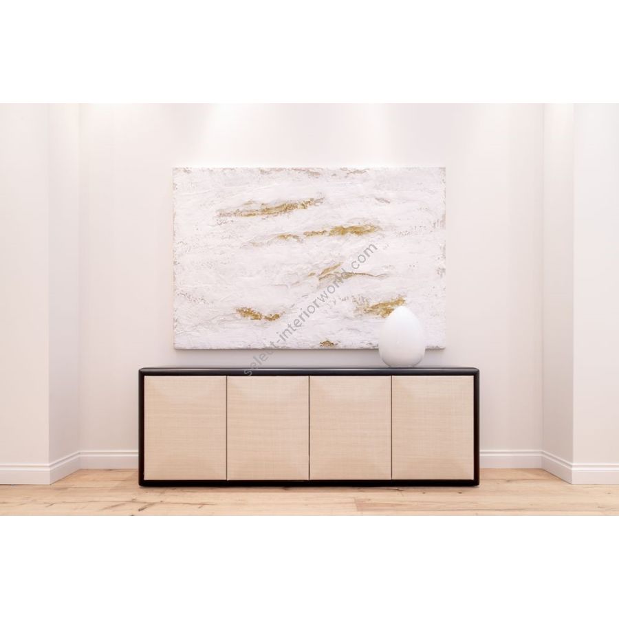 Structure and interiors in white/ivory/black mat lacquered. 2 compartments, 1 internal shelf for each compartment. Four doors covered in raffia sand/camel with push-pull opening.| Dimensions (HxWxD): | cm: 80x230x46 / inch: 31.5"x90.55"x18.11" |