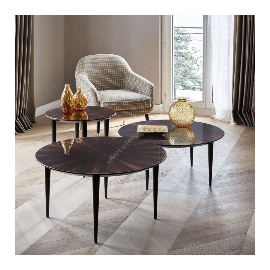 A light small table with ebony or glossy black lacquered top, available in gueridon and coffee versions. Perfect for elegant and sophisticated spaces.