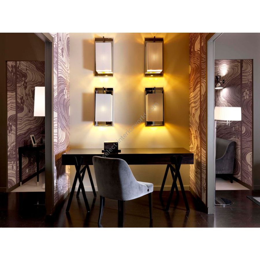 Top available in different finishes: mat/gloss lacquered, mat/gloss ebony makassar veneered, clay/natural gloss erable veneered, gloss albin wood veneered. Metal base: gloss brass/ gloss chrome / bronze/ satin brass/ pewter/ cloudy bronze. 2 drawers with mirror bottom.