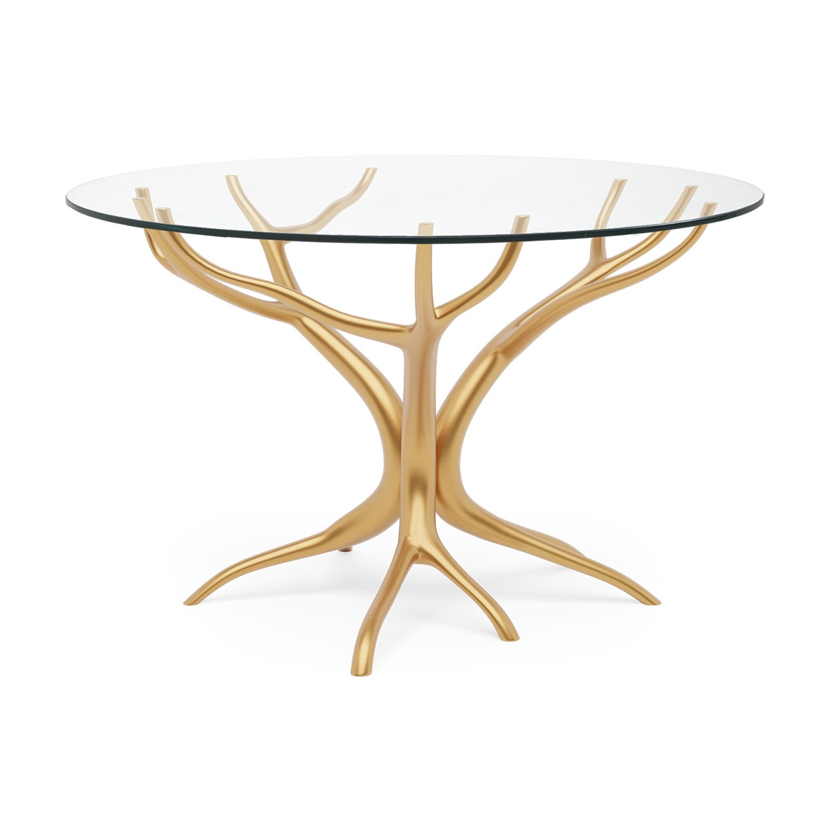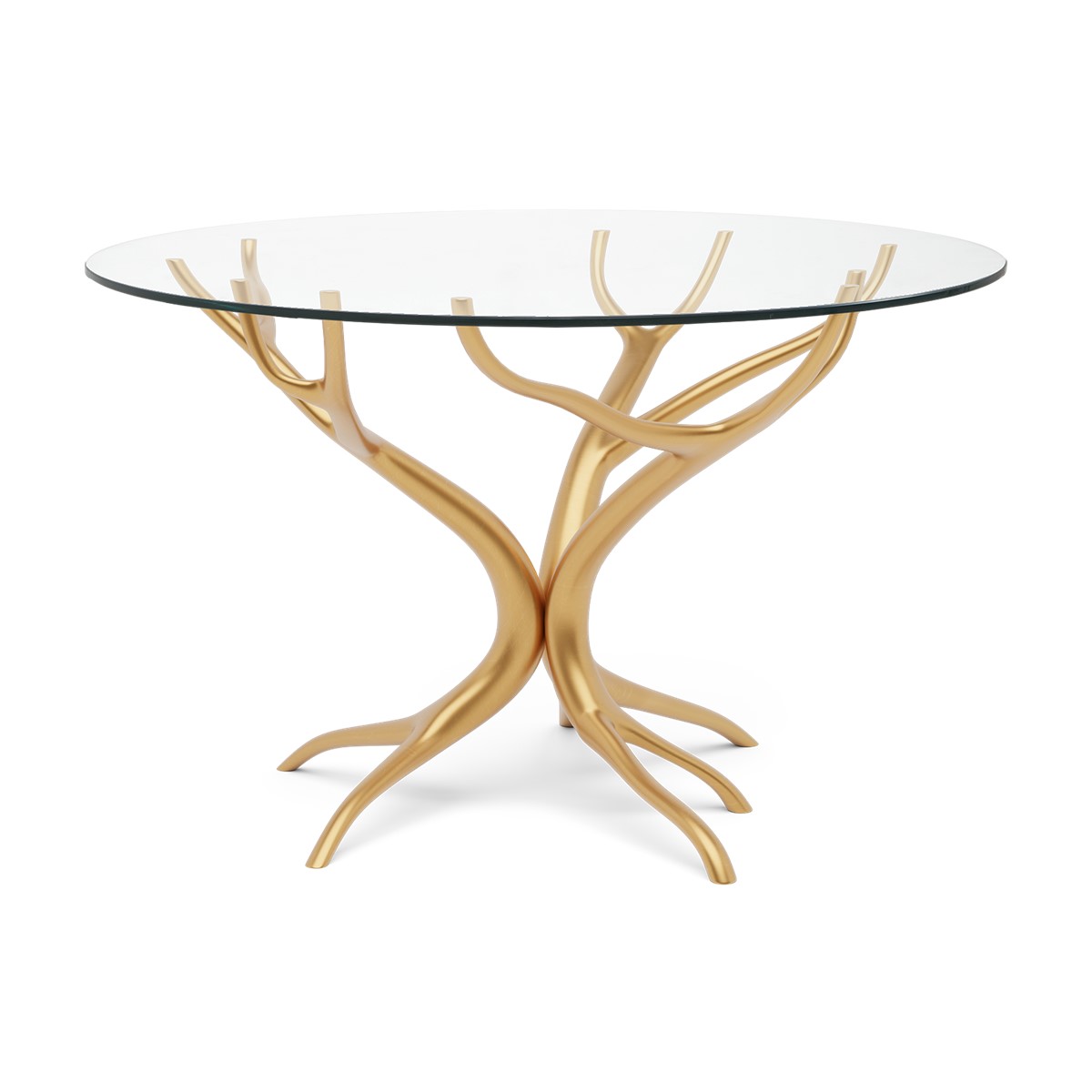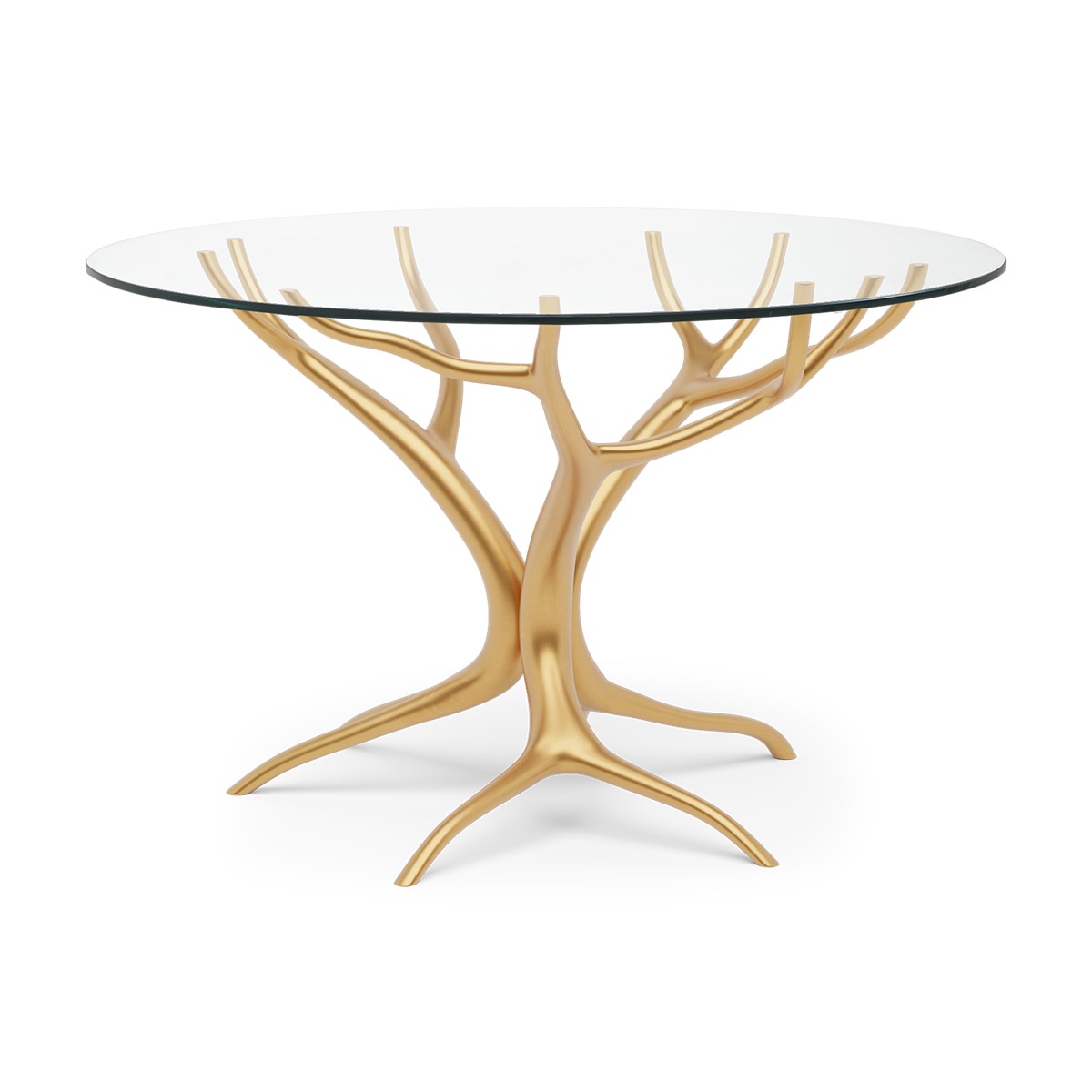 With gracefully stretching hand carved wood ‘branches’, this exquisite center or dining table is topped with clear tempered glass to show the tree-style pattern below to best effect. A truly beautiful statement piece for any dining or living room setting. Also available as a side table (76-0607).