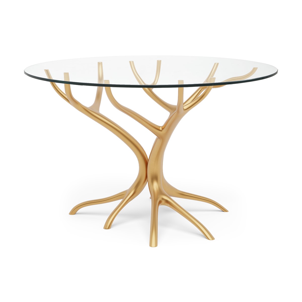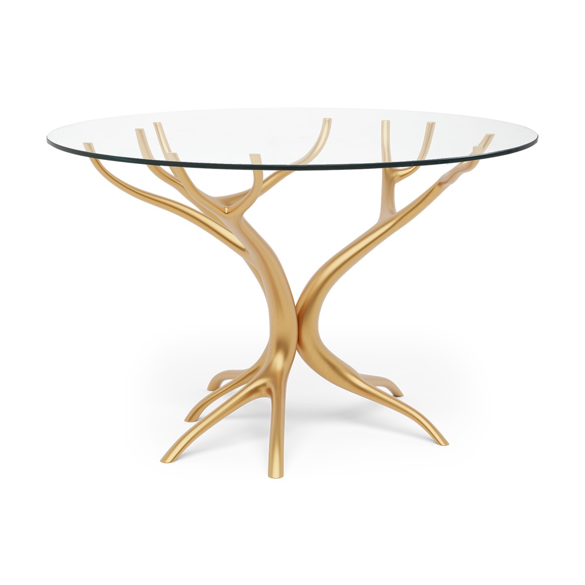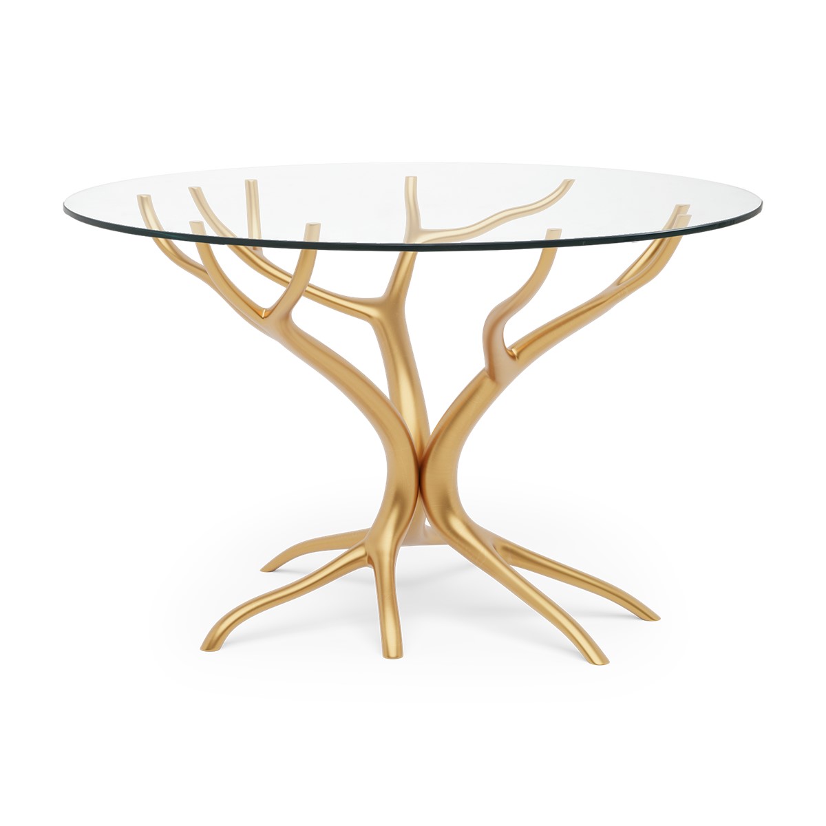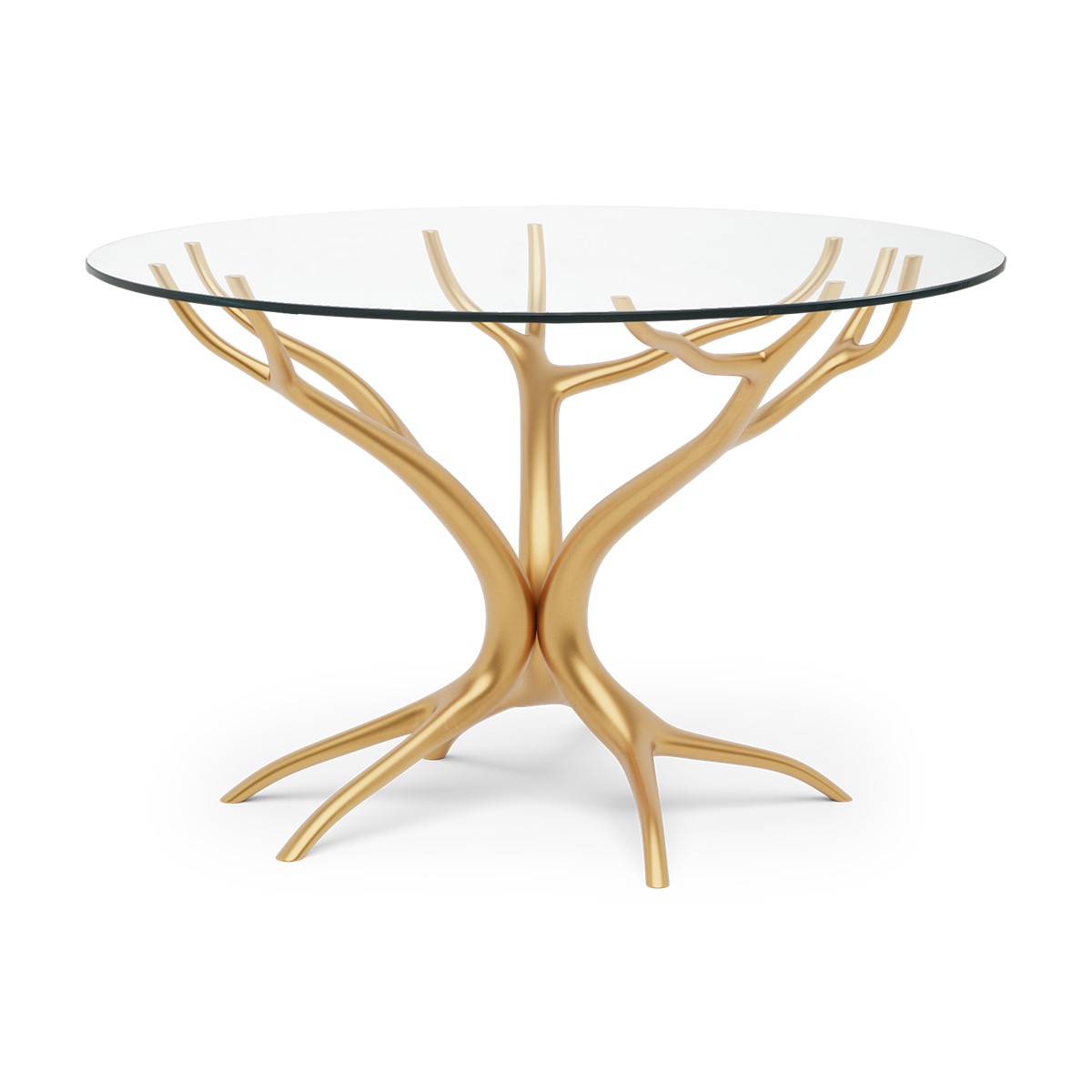 With gracefully stretching hand carved wood ‘branches’, this exquisite center or dining table is topped with clear tempered glass to show the tree-style pattern below to best effect. A truly beautiful statement piece for any dining or living room setting. Also available as a side table (76-0607).