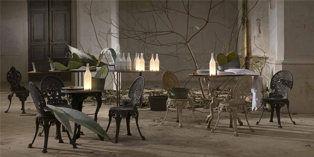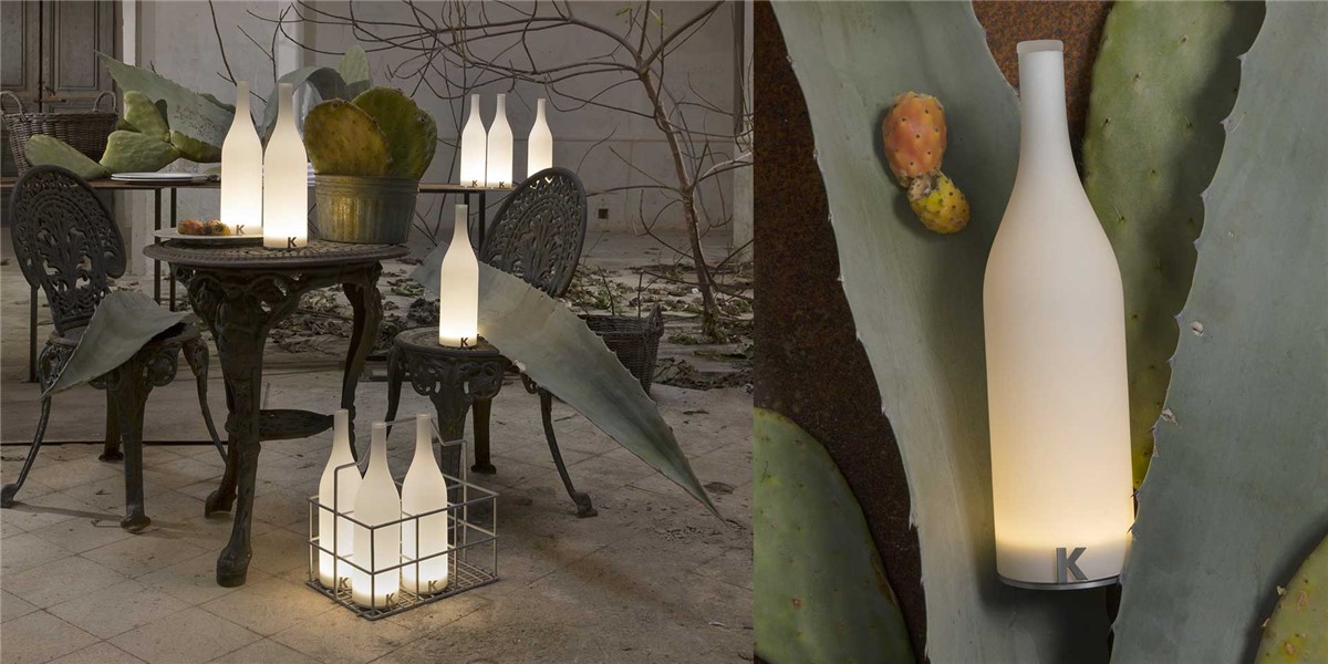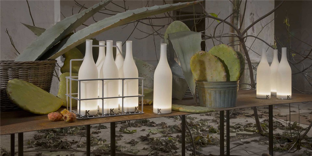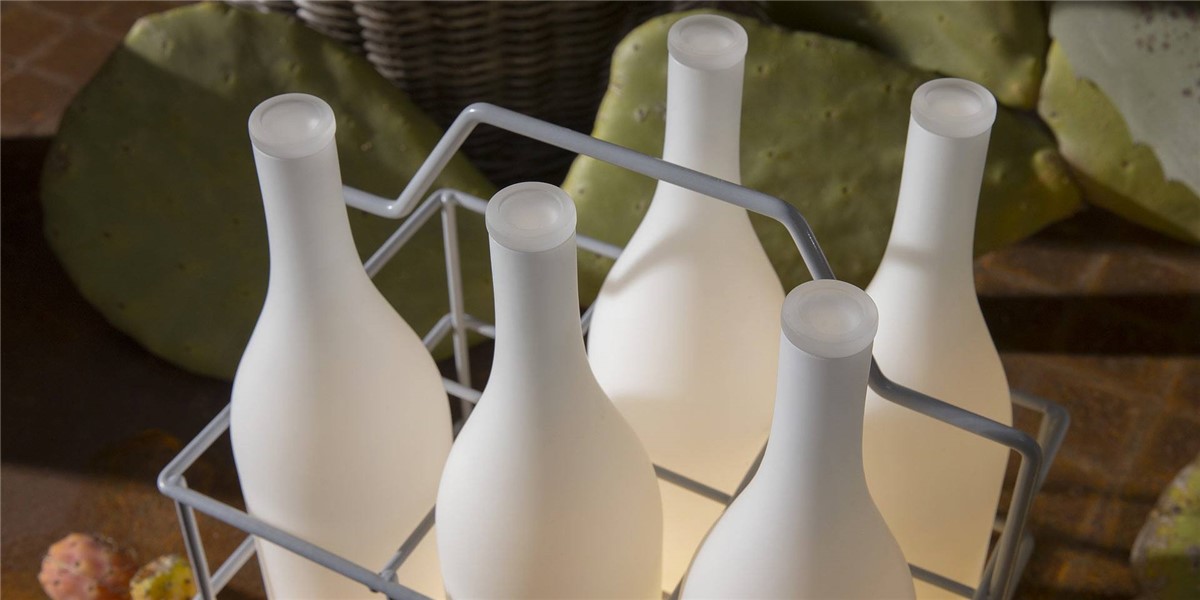 Bacco is a rechargeable, mobile, and wireless table lamp that resembles a wine bottle. It creates a soft atmosphere at your table while you savor a good glass of wine. A 250-lumen LED is hidden in the diffuser, which is made of satin white glass. It sits on an aluminum base and can be removed after six hours of use to recharge the LED. Bacco can be carried anywhere in a metal basket, Perbacco, which also refers to the milk basket it once was.