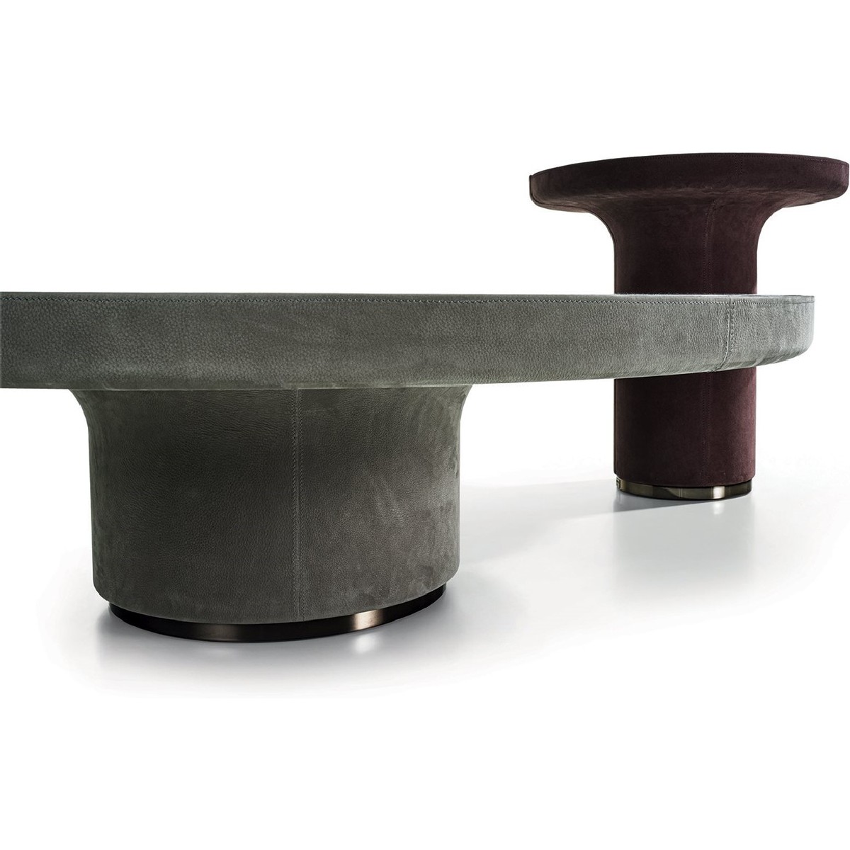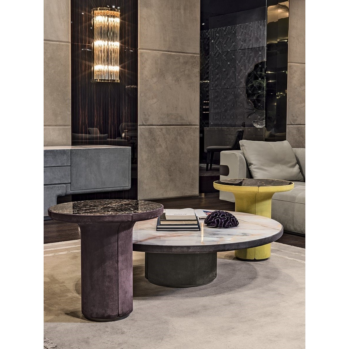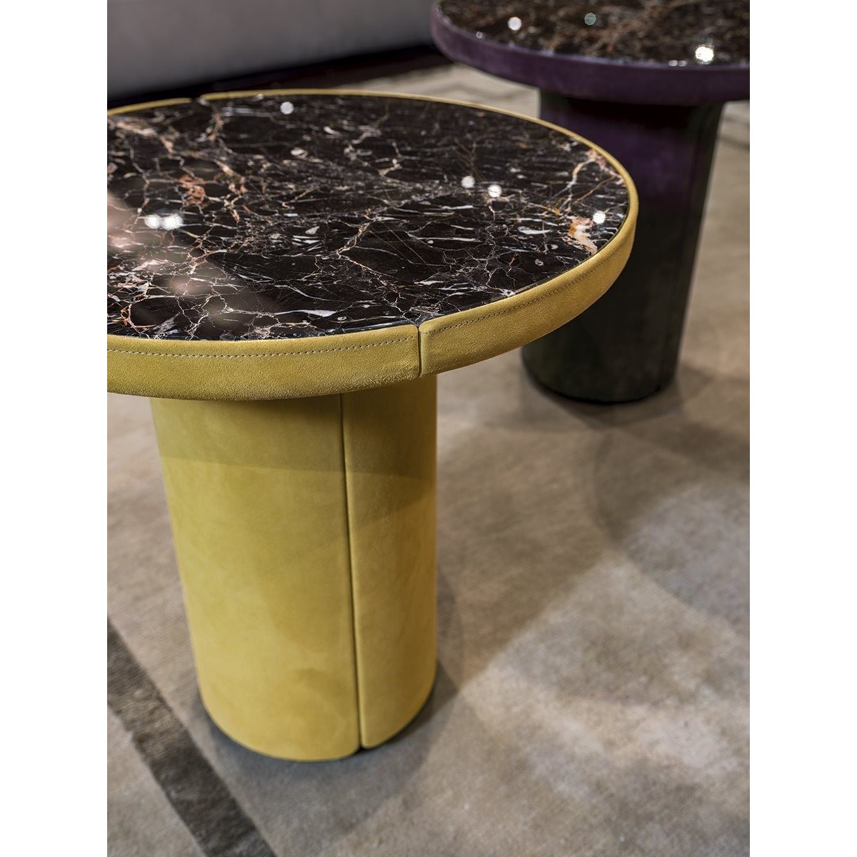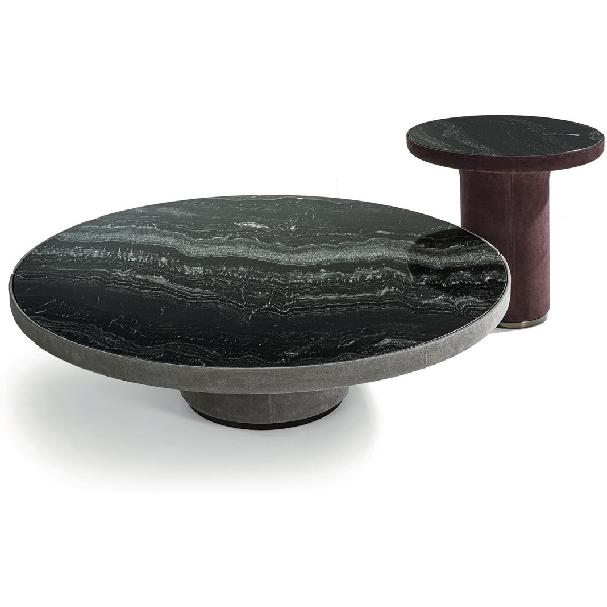 Small round table with internal structure in painted metal and shell in manually moulded glass fibre covered in leather from the range. Ground metal baseboard and edges in the following finishes: Satin nickel, bright shaded brown, bright light gold, matt Champagne gold, bright chrome, bright black chrome, matt satin bronze, bright pink gold, matt pink gold, Black Rose gold. Top finishes: bronze or smoky mirror, White Carrara marble, Imperial Brown marble, Sahara Noir marble (glossy and matt polyester finish), Dover White marble, Panda White marble, Guatemala Green marble, Corteccia marble, Port Saint Laurent marble, Red Levanto marble, Bardiglio Nuvolato marble, Elegant Brown marble, Shale Rosewood marble, Emperador Dark marble, Silver Wave marble, Agatha Black marble, Frappuccino marble, Calacatta marble, Fusion Light marble, Patagonia marble, Explosion Blue marble, Fusion Multicolor marble, Juliet Quartz marble, Calcite Azul marble, Azul Macauba marble, Portoro marble, Red onyx, wood worked in “wedges” and marquetry in wood: glossy Ebony, glossy Canaletto walnut.