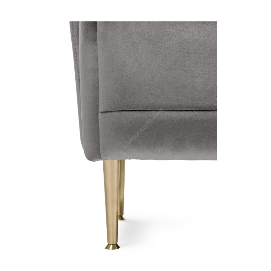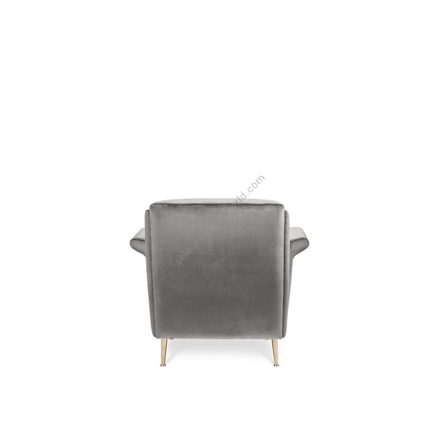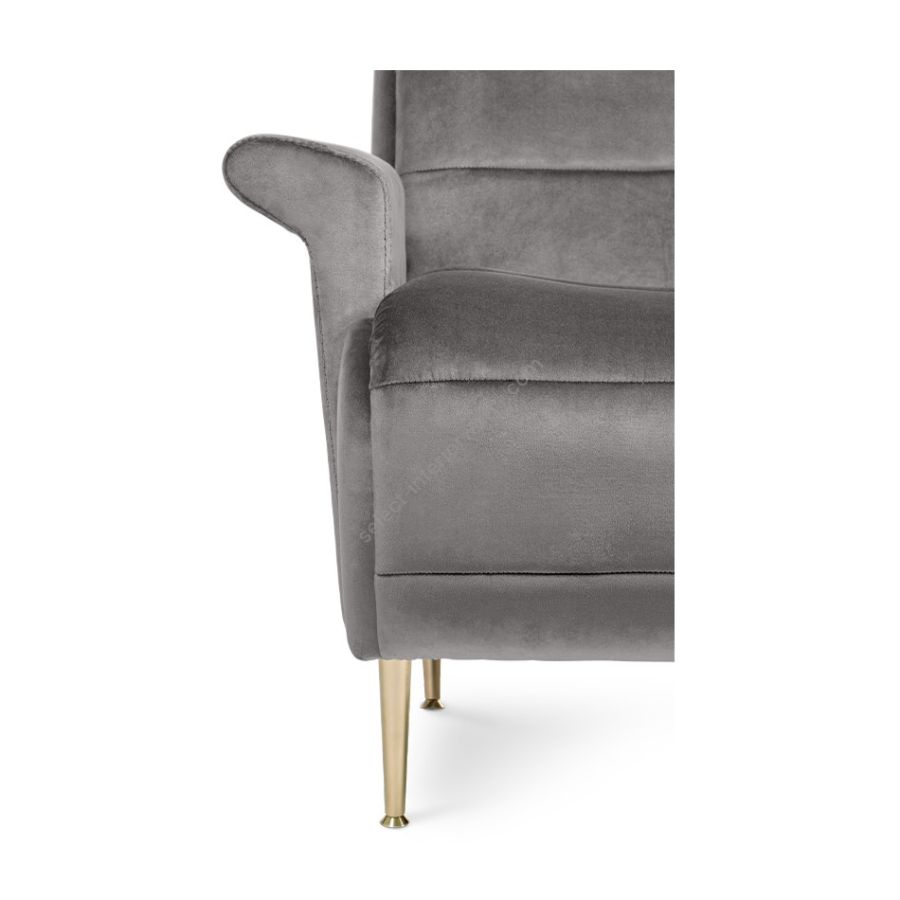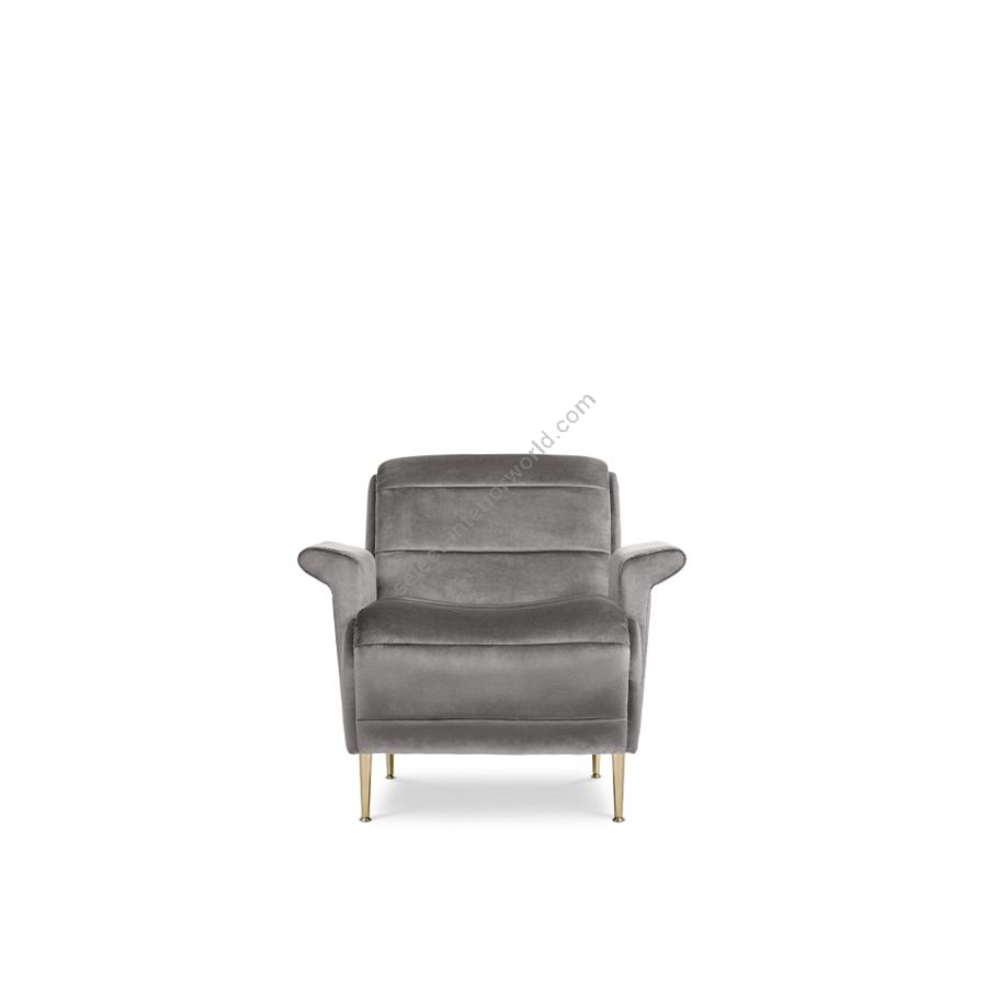 An armchair with modern contours both on the slightly reclined back and on the rolled seat. Inspired by the feminine silhouette of Hollywood actresses, finely upholstered, features tiny tapered metal legs. The key shape of the sloping armrests and the horizontal tufting make this armchair an accent piece for any living room.