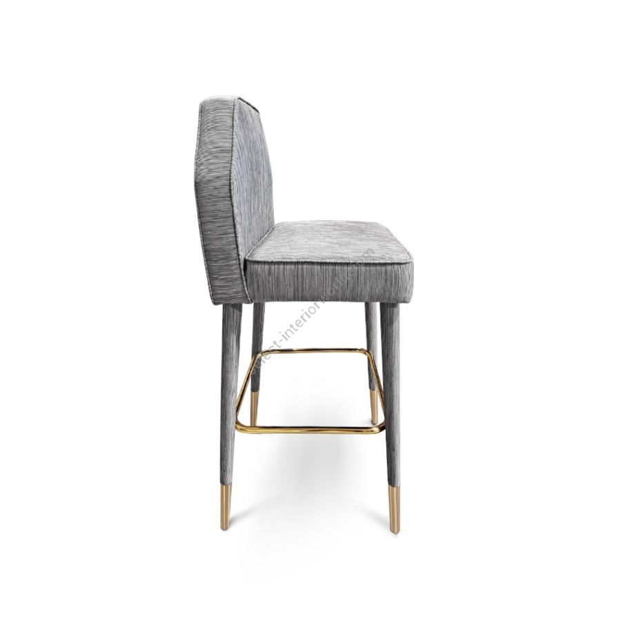A deluxe look for a chic bar or lounge area, perfect for a mid-century modern home. Doris Bar Chair looks like an upholstered accent chair on a tall frame. With simple lines matching perfectly with other pieces in the space, it features a rectangular shape on the back and a four-tapered leg frame, accented by polished brass ferrules on the bottom.
