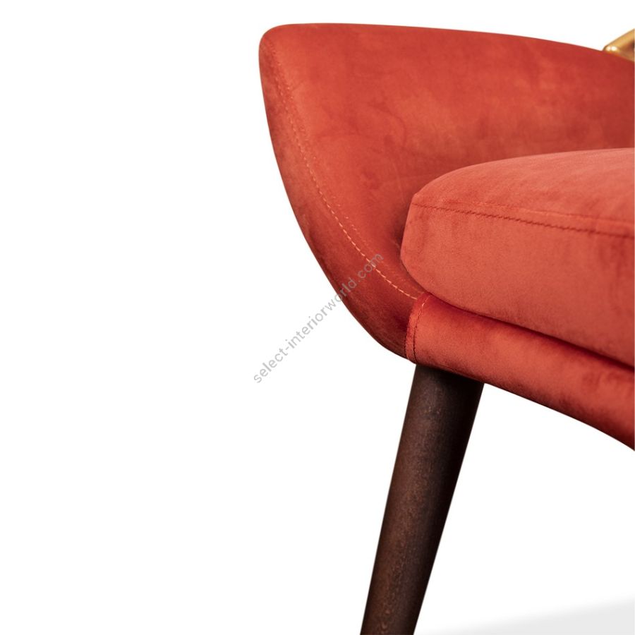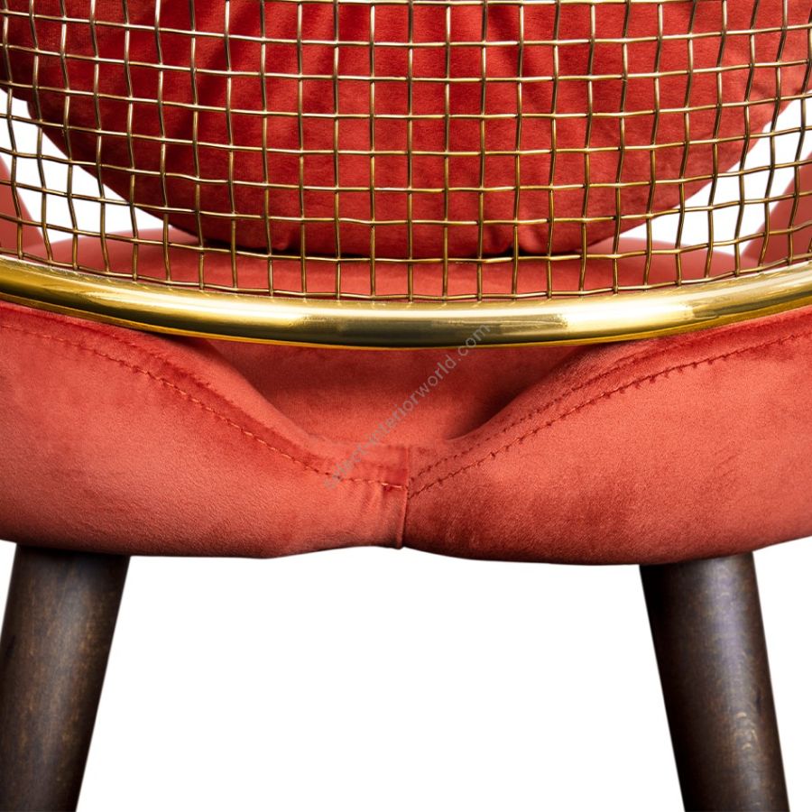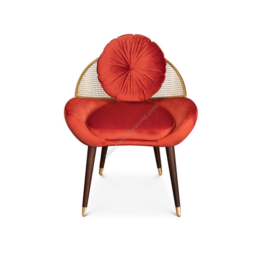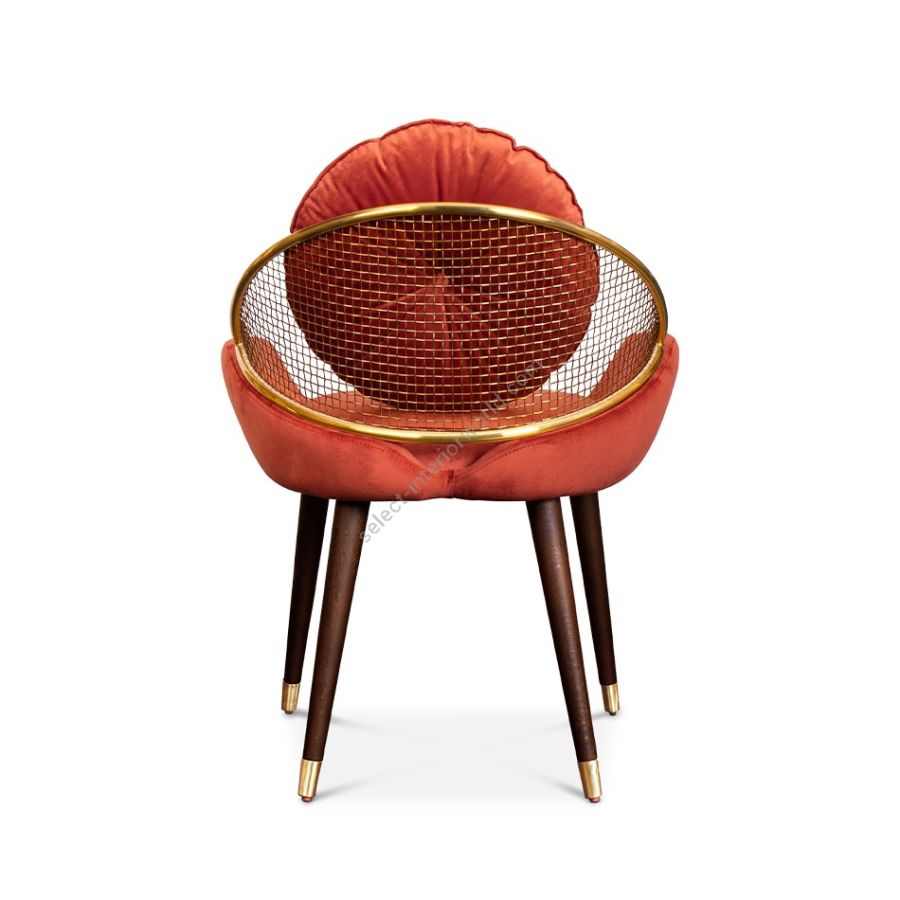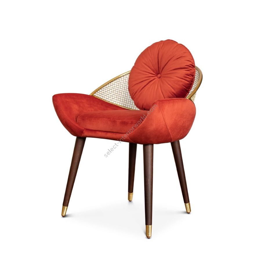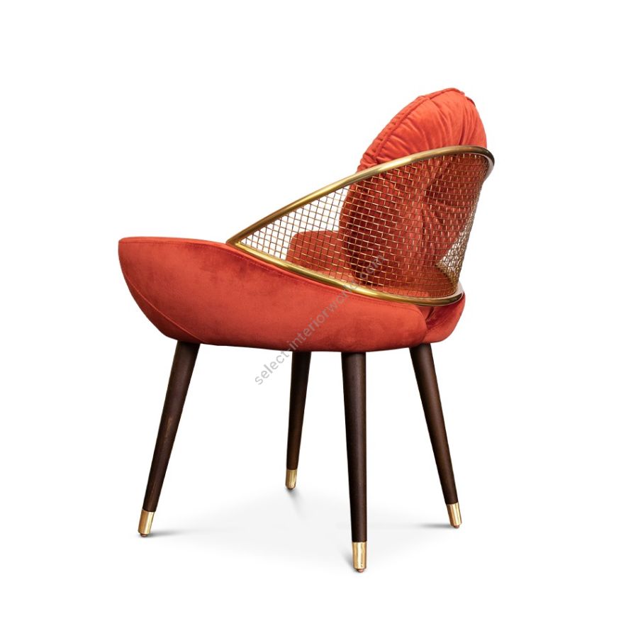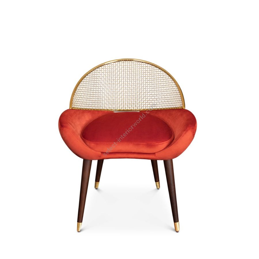 Garbo dining chair is a timeless and mysterious piece, inspired by Hollywood Boulevard's Walk of Fame. Upholstered seat with a removable cushion, complemented by a crescent low back made handcrafted metal. Four wooden legs with metal-detailed feet provide sturdy support for this elegant and sophisticated chair, perfect for modern dining spaces.