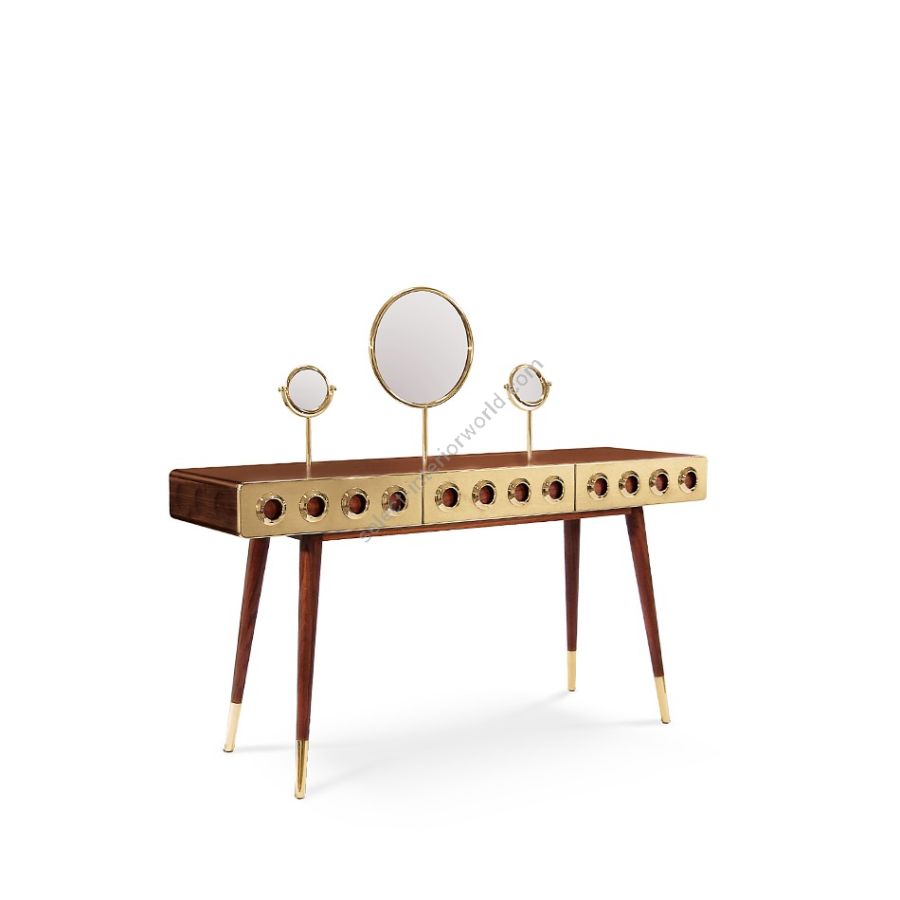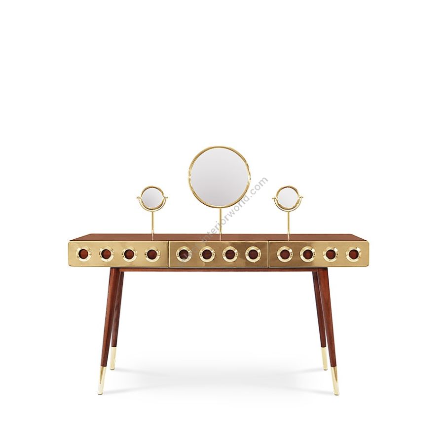 A stunning addition to your glamorous boudoir. Constructed with solid wood, it boasts three front drawers in metal. Supported by atomic legs, the retro table showcases three bullseye mirrors with metallic rims and rotating smaller ones.