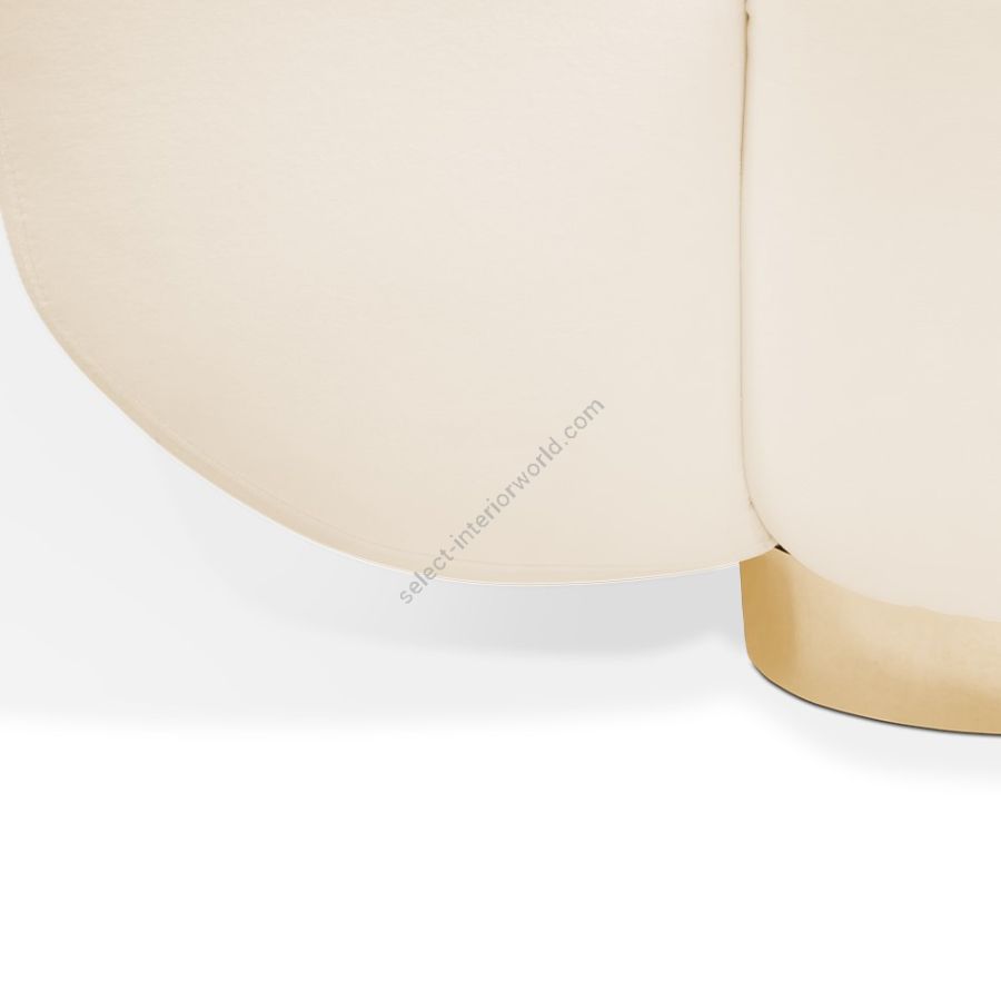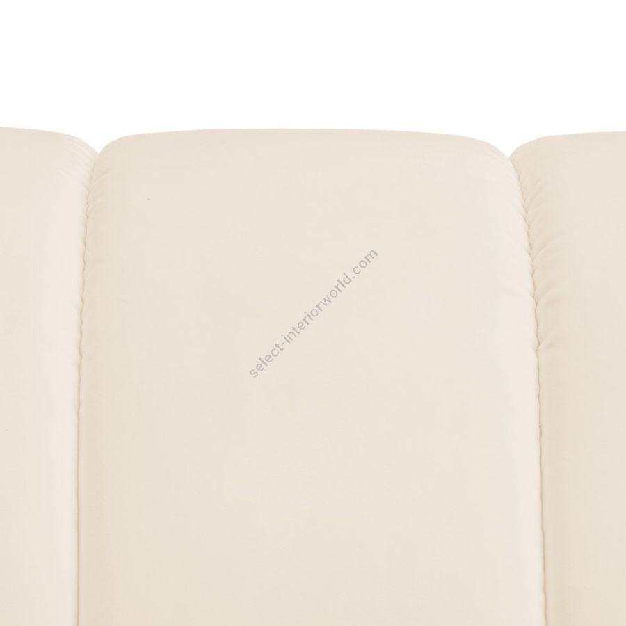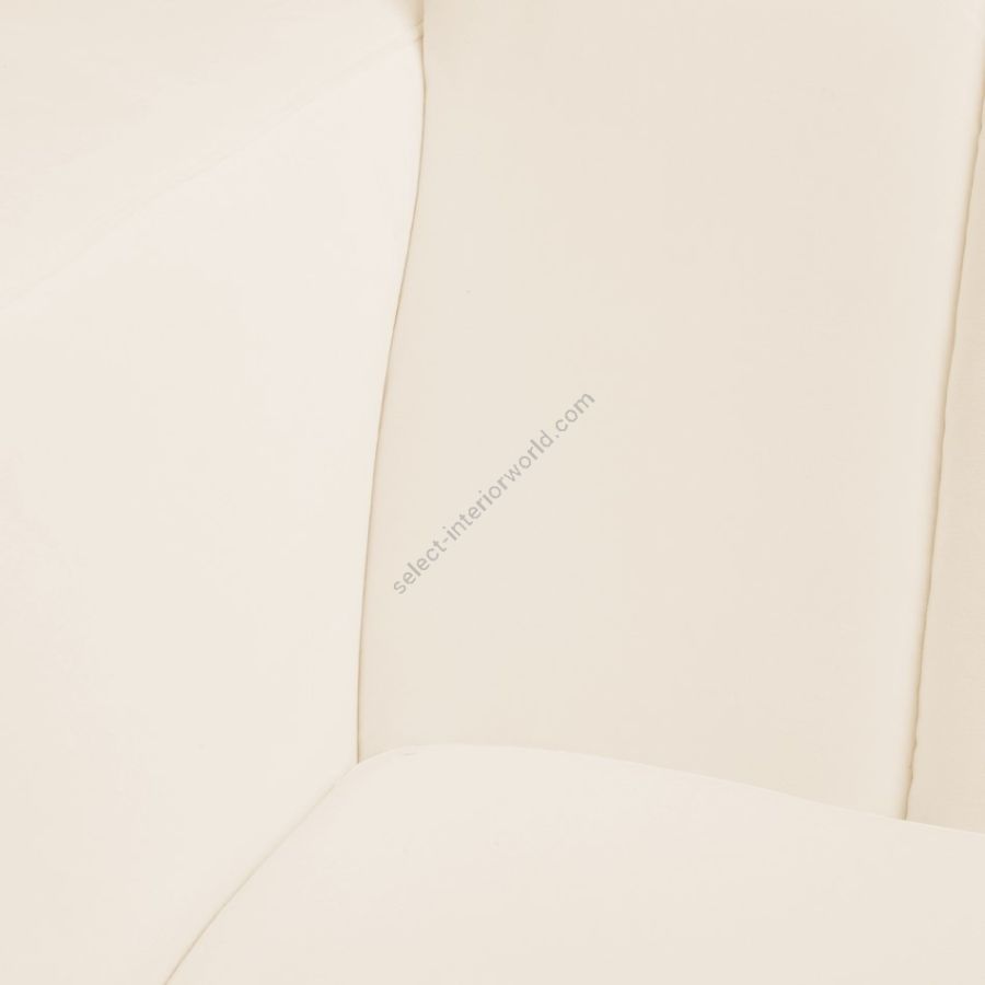 A sofa that combines some details from mid-century style with a contemporary design vision. The base is rectangular but it has a contrasting low back with rounded shapes. Upholstered with sophisticated leather and finished with piping detail, it's a desirable mid-century modern piece.