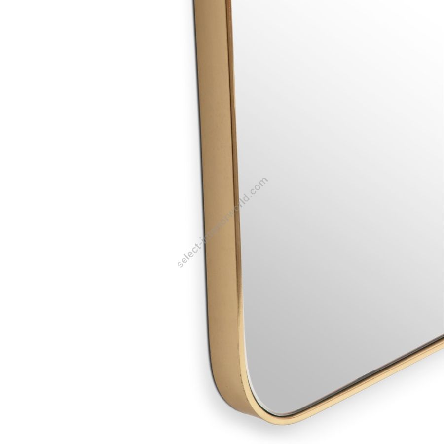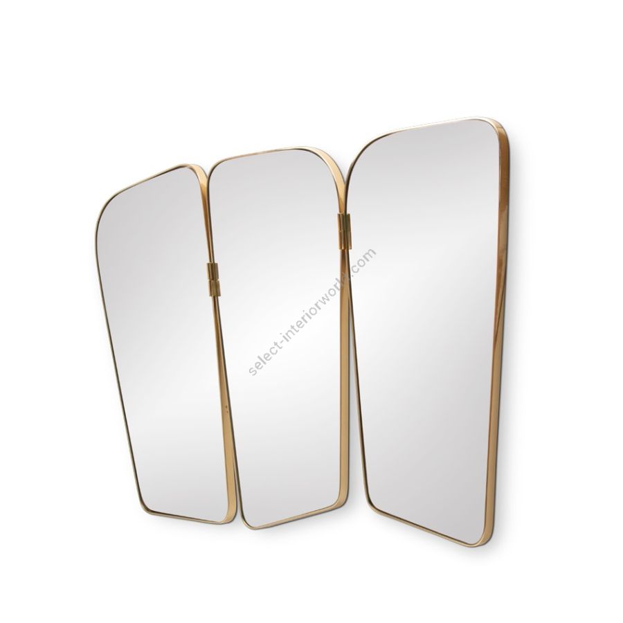 A beautifully designed vanity wall mirror. It features three panels and an irregular shape with a golden strap of plated brass that evokes a mid-century modern style. It can be hung above a sideboard or a console and still give that retro look to your bedroom or living room.