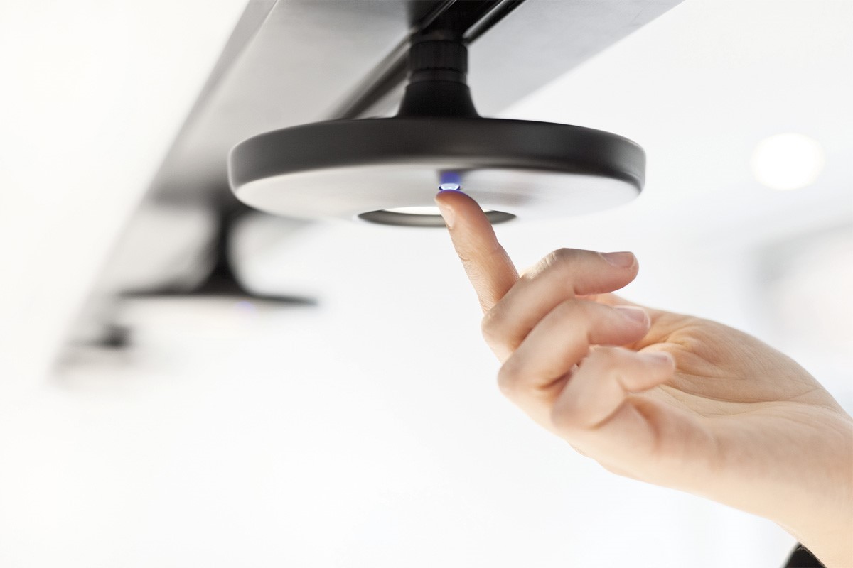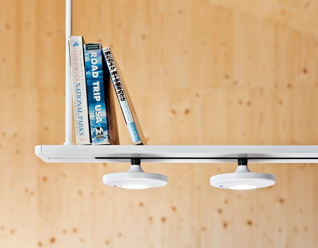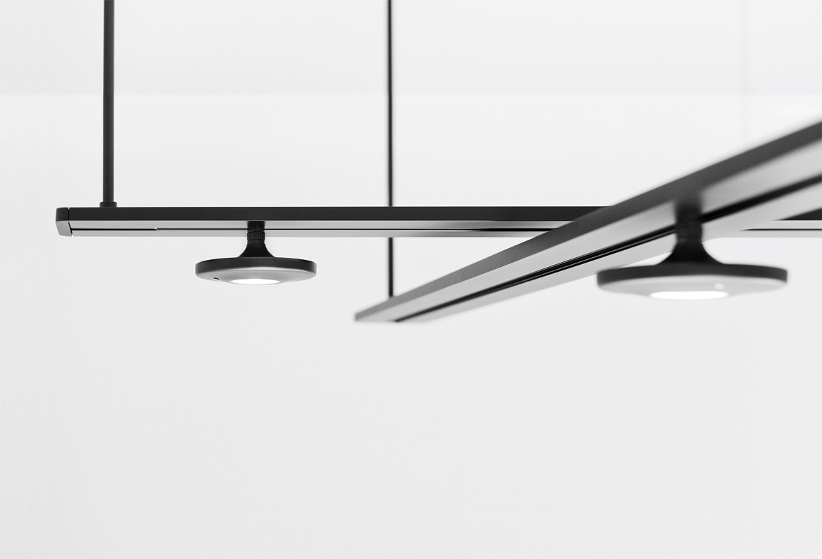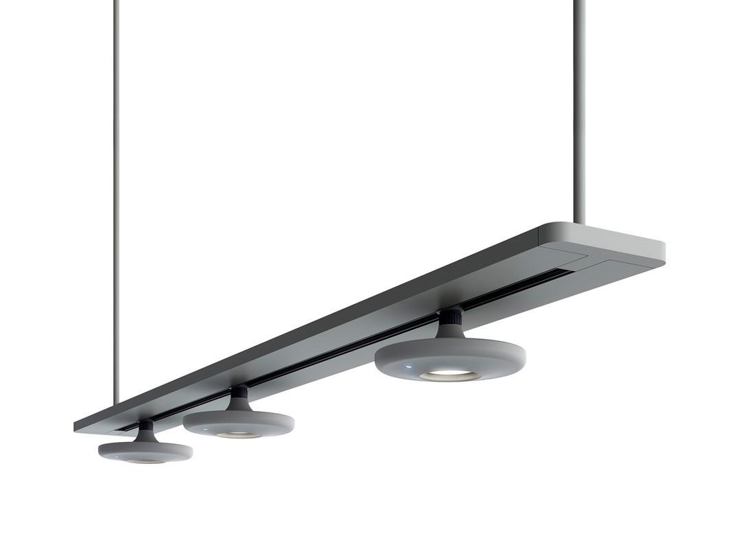 Suspension lamp with track system with aluminium shades that can be placed anywhere along the track. Height adjustable. Integrated LED on each shade that and can be dimmable, turned on and off independently by a touch sensor. Display favourite objects or books on Button’s topside shelf. Safely holds up to 30Kg / 65lbs.