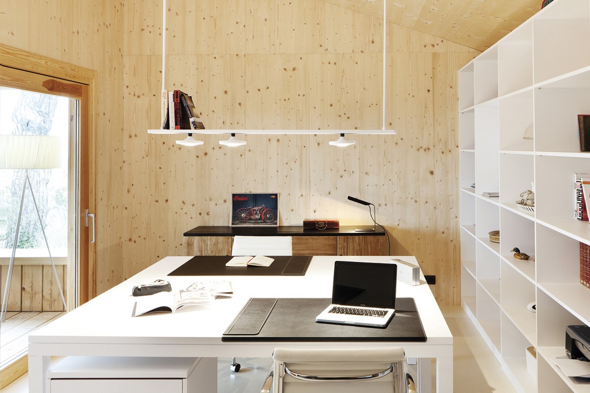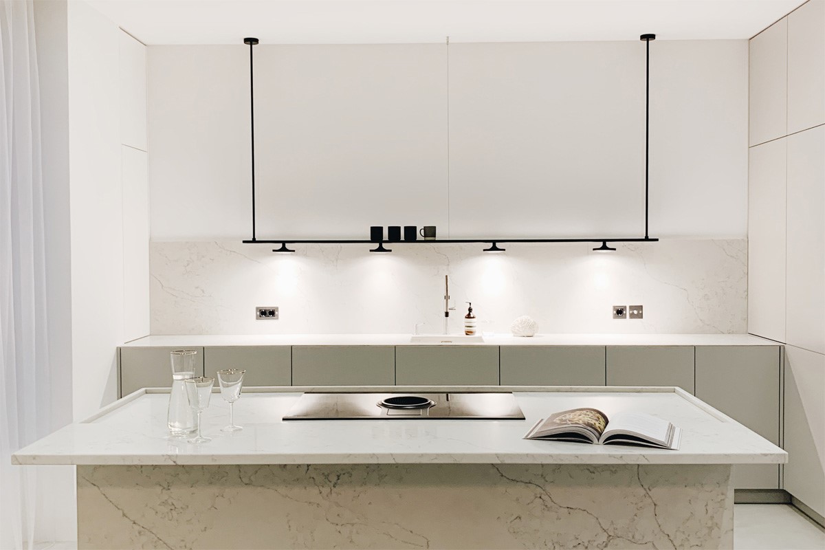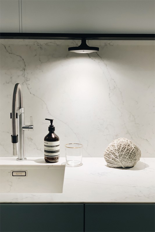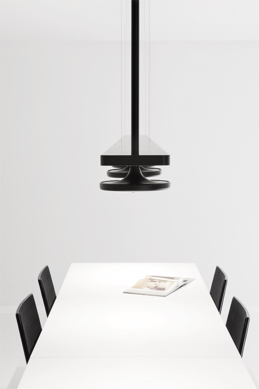 Suspension lamp with track system with aluminium shades that can be placed anywhere along the track. Height adjustable. Integrated LED on each shade that and can be dimmable, turned on and off independently by a touch sensor. Display favourite objects or books on Button’s topside shelf. Safely holds up to 30Kg / 65lbs.
