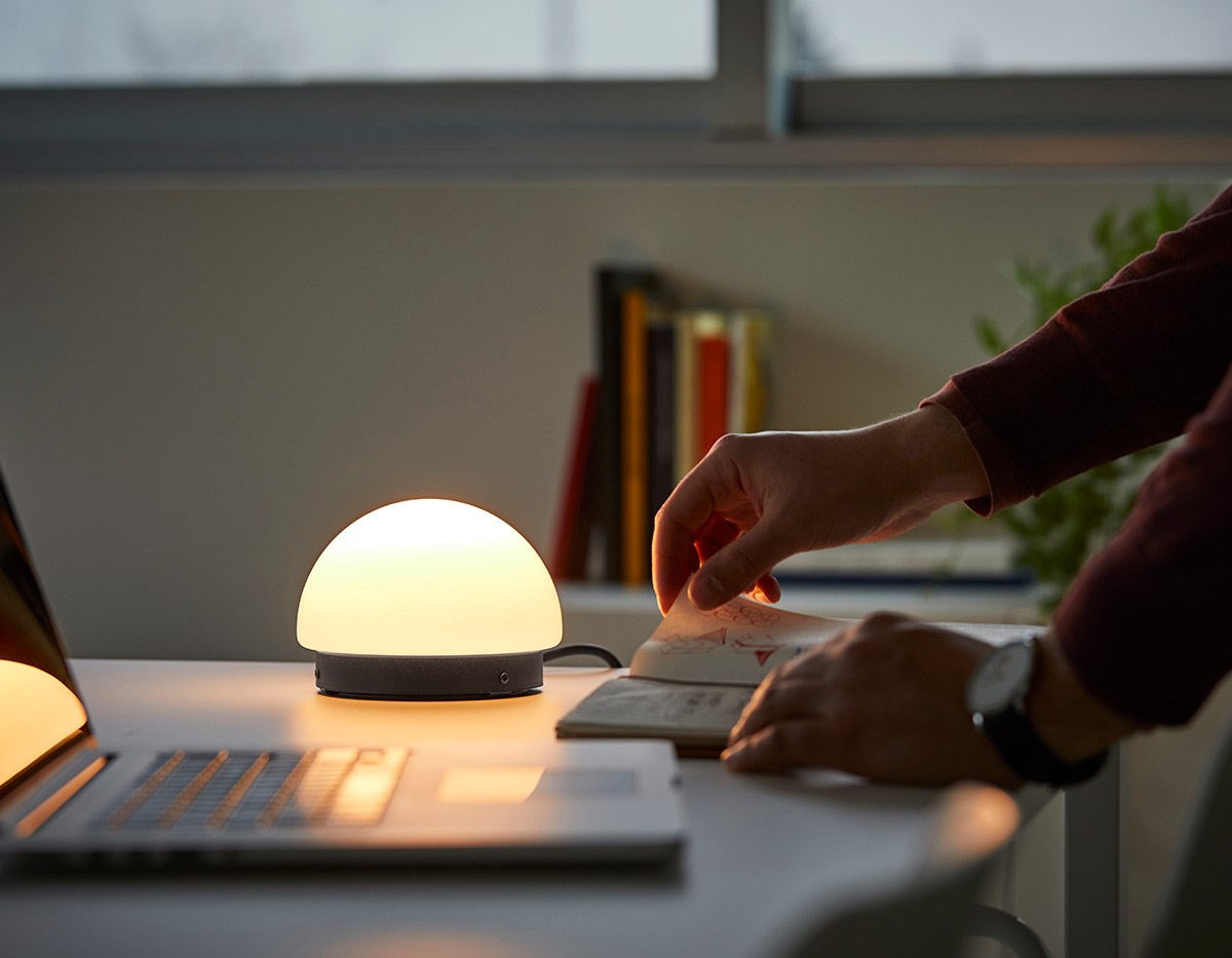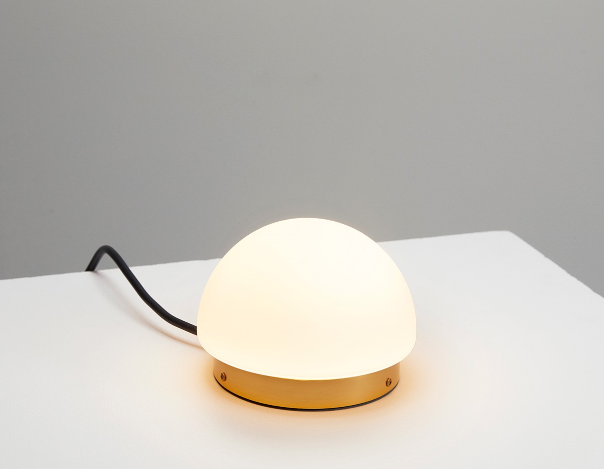 Metallic table lamp with satin glass shade providing direct and indirect light.