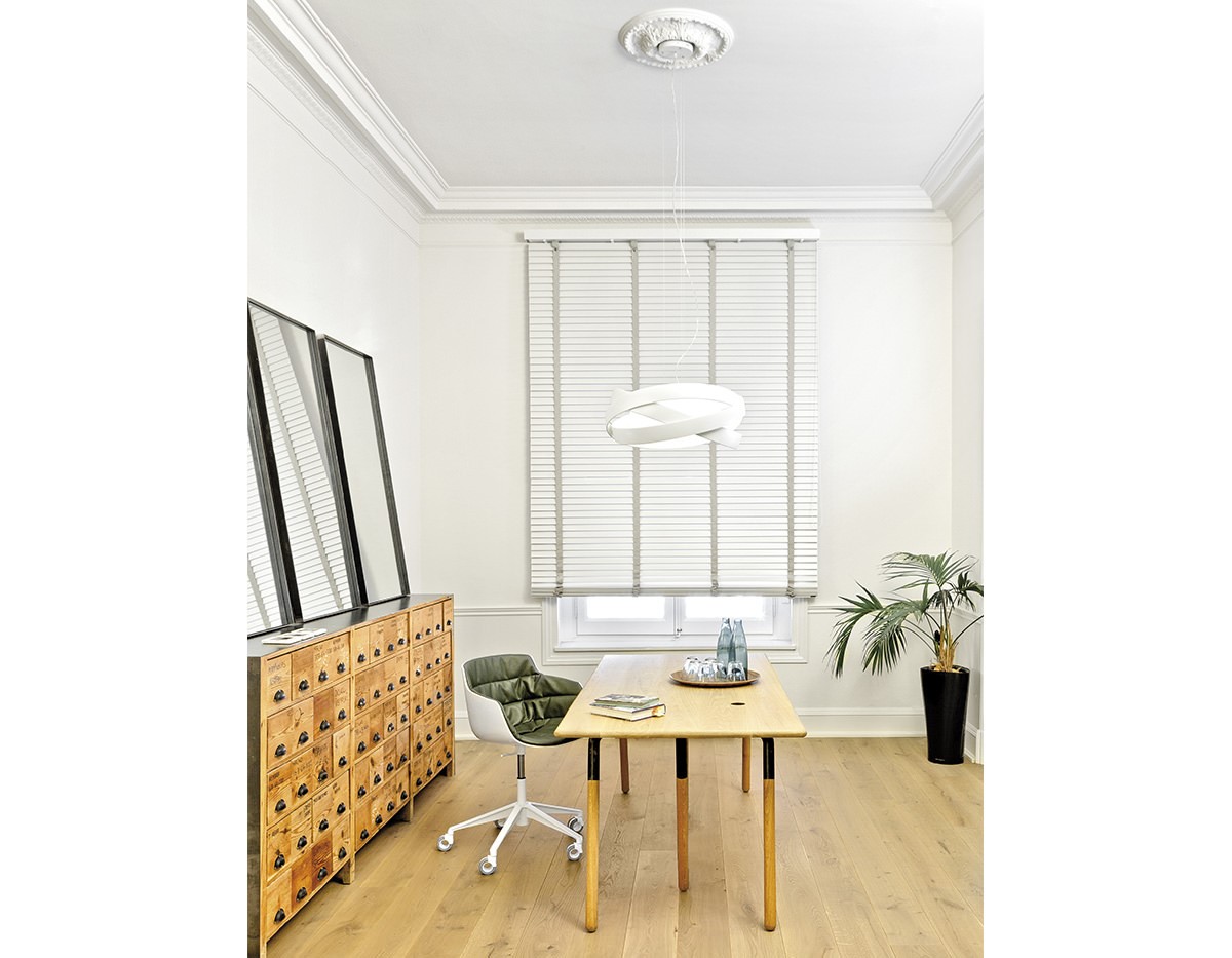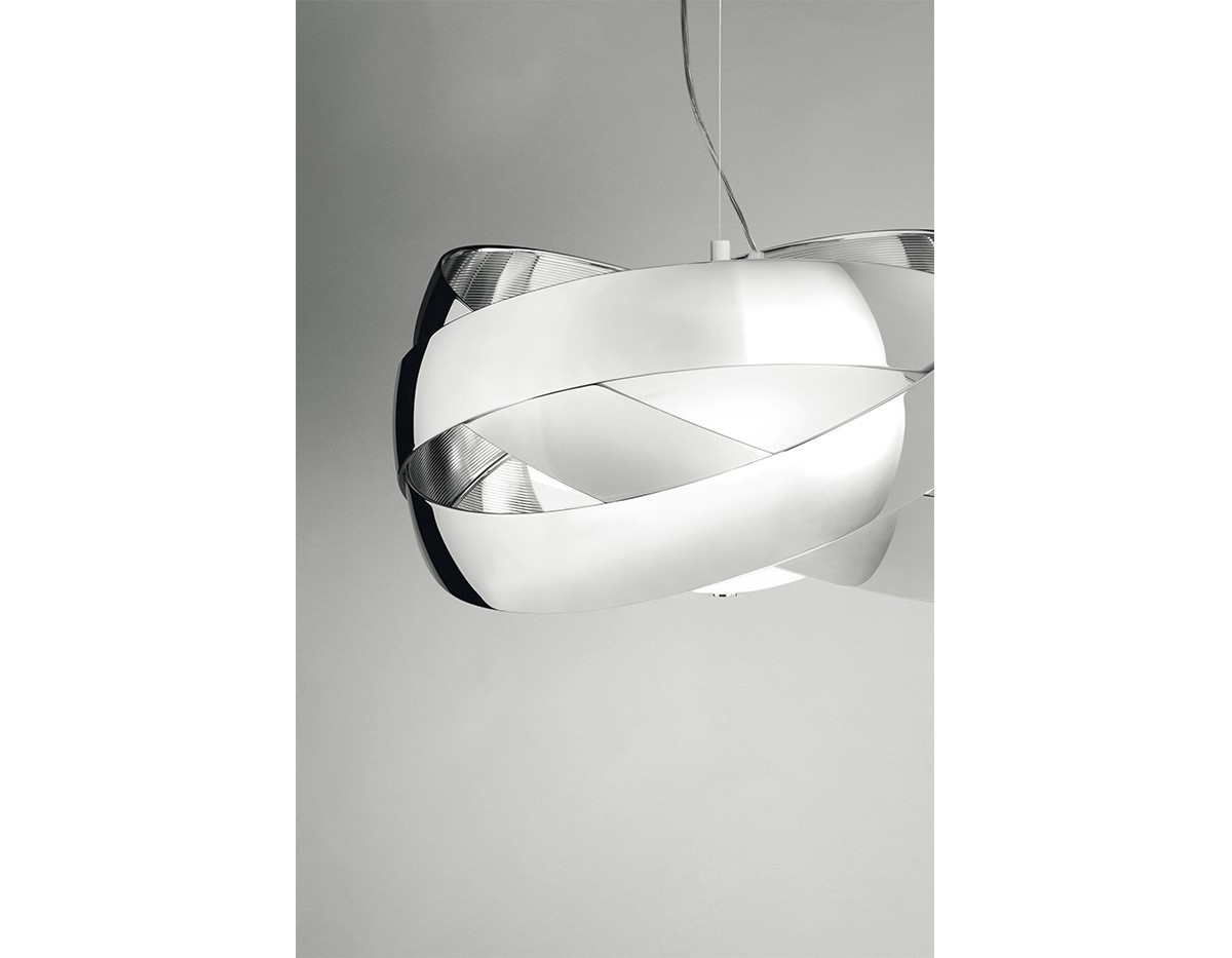 Pendant providing direct and indirect light. Shade is made of a satinated glass and decorative aluminium rings. Adjustable height.