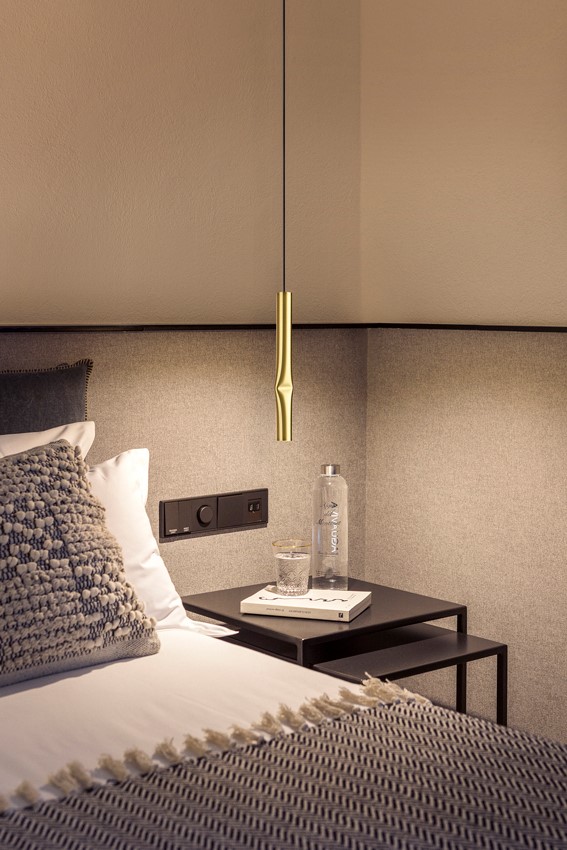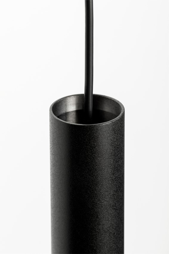 Metallic suspension lamp in three sizes. Shade made with a metal tube smashed in the middle and an acrylic lens with integrated LED. Adjustable height and individual canopy, suitable for creating compositions.