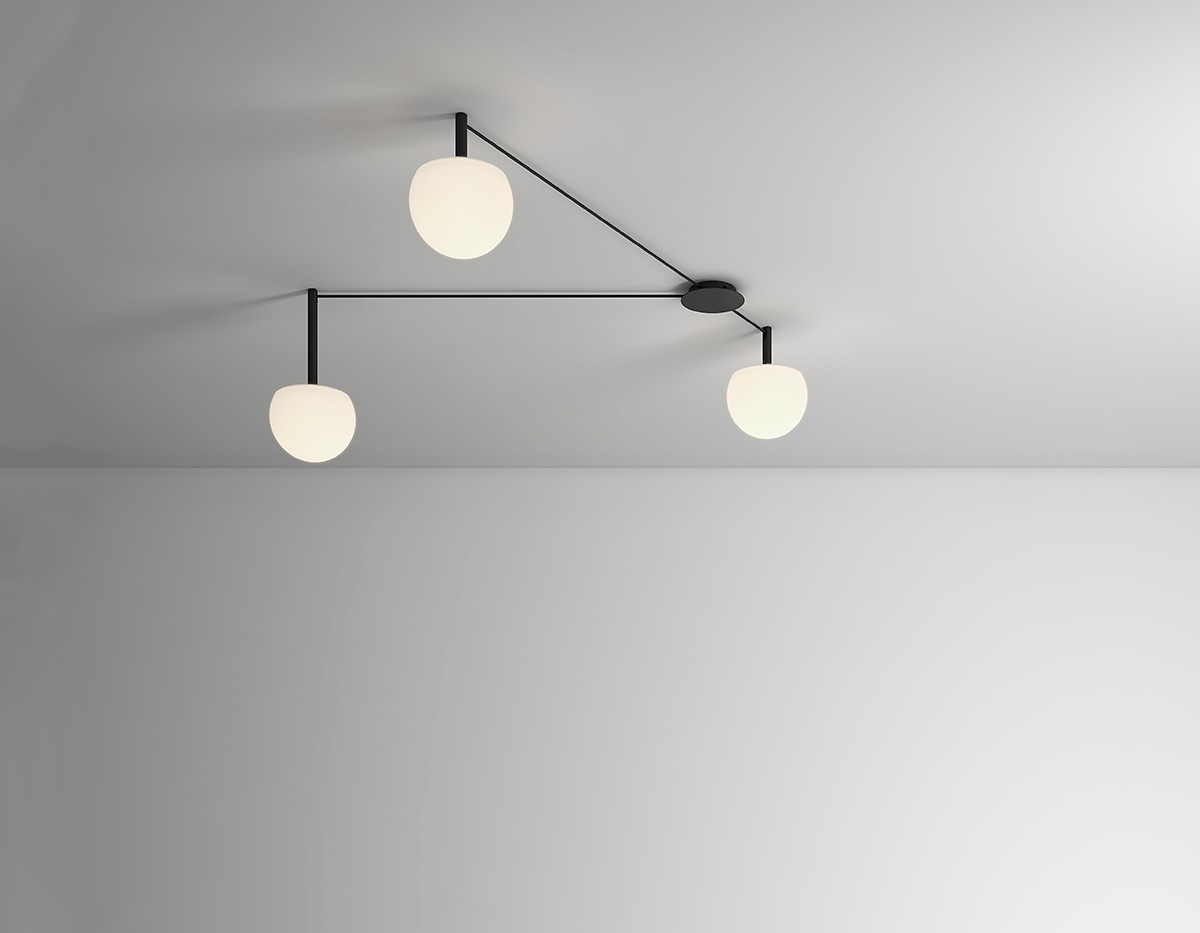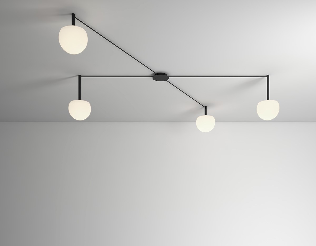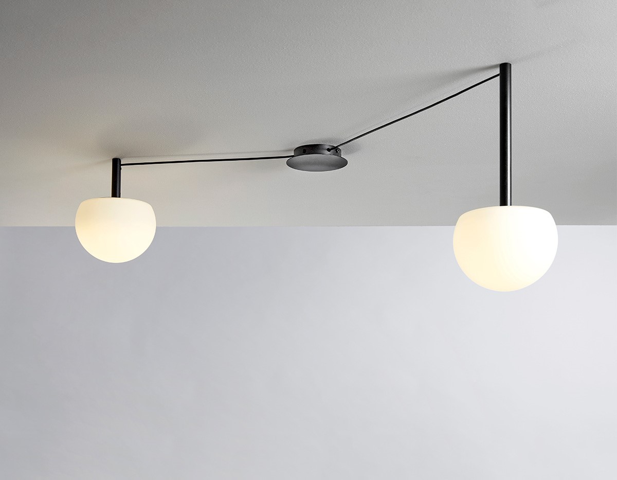 With a single, versatile canopy, several glass hemispheres sprawl across a ceiling in custom patterns to illuminate specific areas. The cables connecting the lights are offered in different lengths while the lights are suspended on metal stems. Infnite configurations can be created from this simple and functional design.
