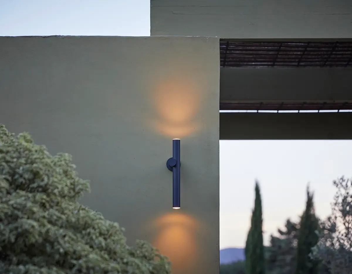 Metallic outdoor wall light. Integral LED providing direct light. Double-layer coating for high resistence to corrosion and other environmental conditions. Hard wired (no plug). Remote driver.