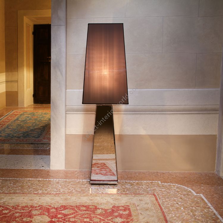 Floor lamp with structure covered in smoked bevelled mirror. Brass details in polished black nickel finish. Lampshade in linen fabric mixed with cotton.