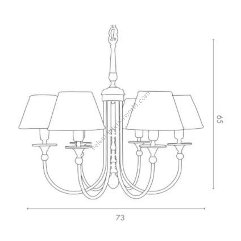 Six-light chandelier in antique brass and decorated metal, fabric lampshades.