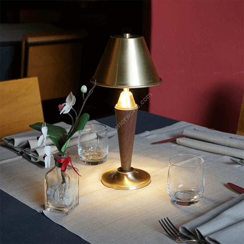 Table lamp ALENA in brass with wooden particular, various finishes proposal. For indoor and outdoor use.