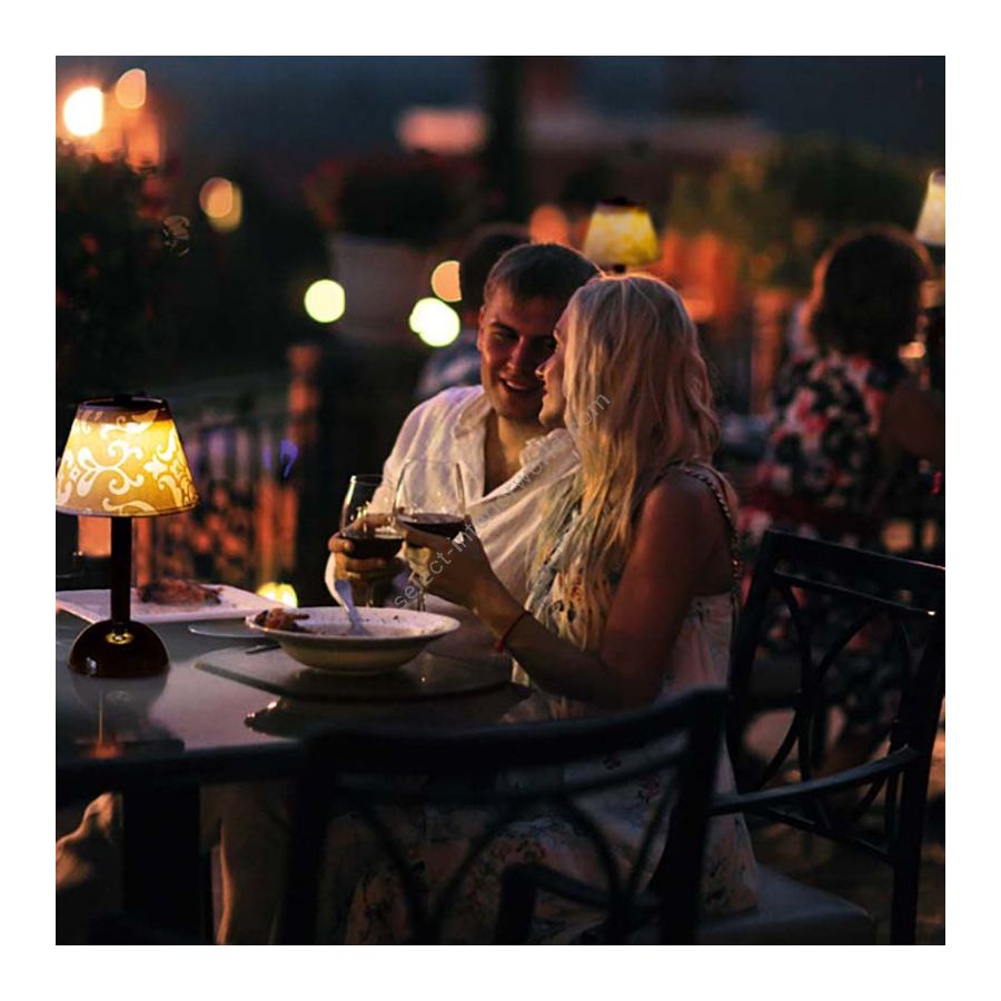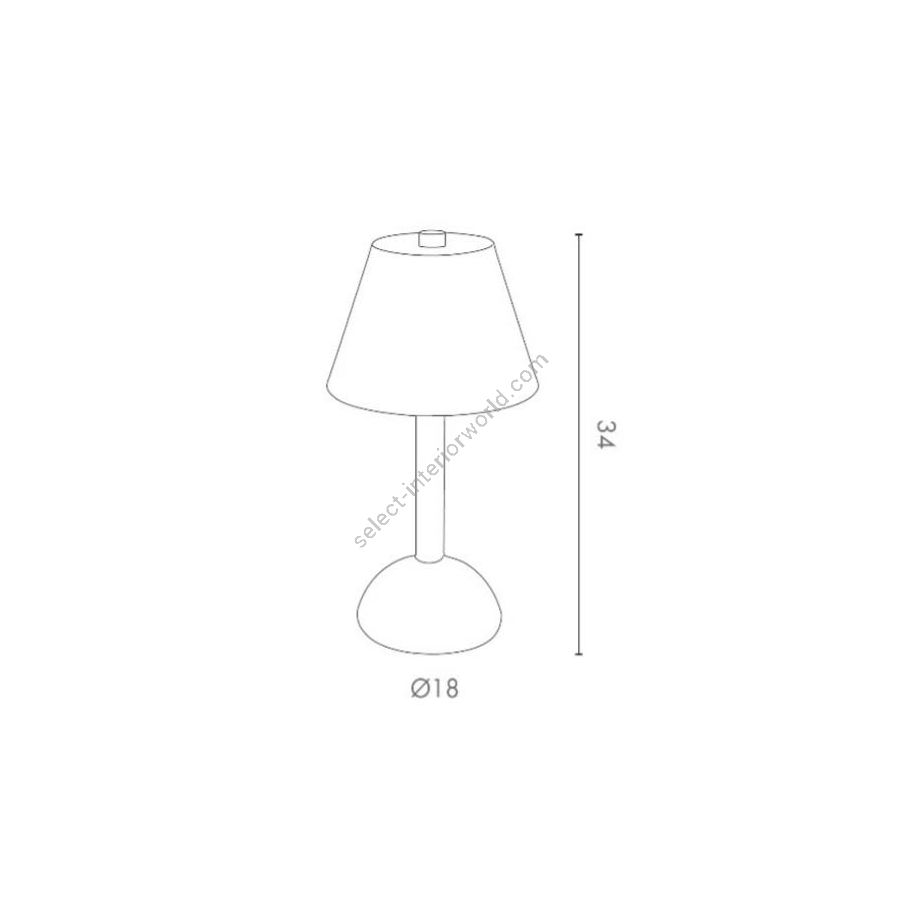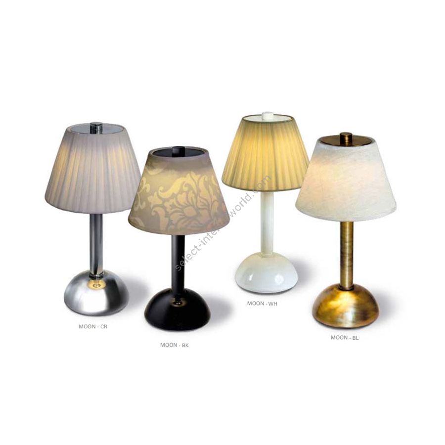 MOON cordless table lamp with base and stem in brass sheet lacquered in various finishes and colours. Conical lampshade Ø18 cm in various fabrics. For indoor and outdoor use. No water resistant. Rechargeable battery autonomy 8 hours.