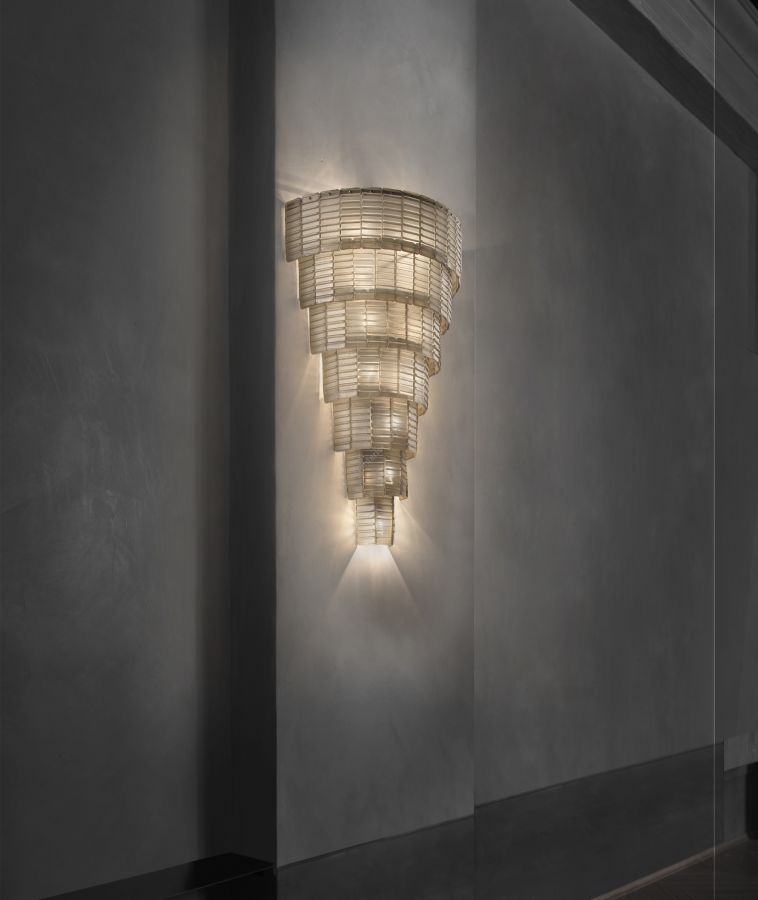 Plissè Collection is a collection of customizable suspensions: its modular structure allows the development of small, medium and big projects. Concentric circles chase each other in a sort of pyramid, creating a monumental vision. This creation is dressed in a pleated texture, inspired by fabrics and skillfully reproduced on handmade glass by Murano glass craftsmen
