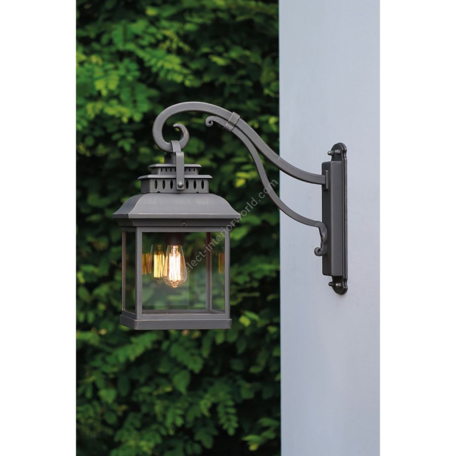 Exclusive wrought iron outdoor wall lantern, vintage style, handmade by Robers. The fixture is nice for a Classic or modern outdoor interior. Shown in a old bronze finish but can be special ordered in Black silver, Old black or Patina.