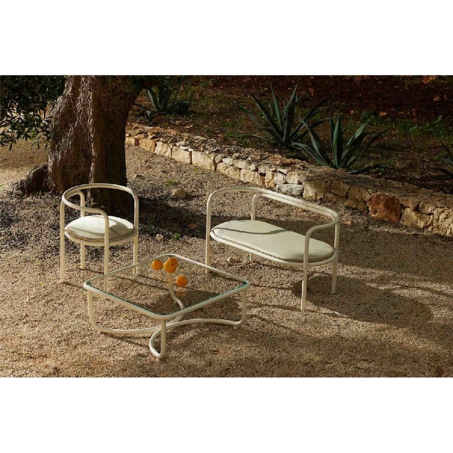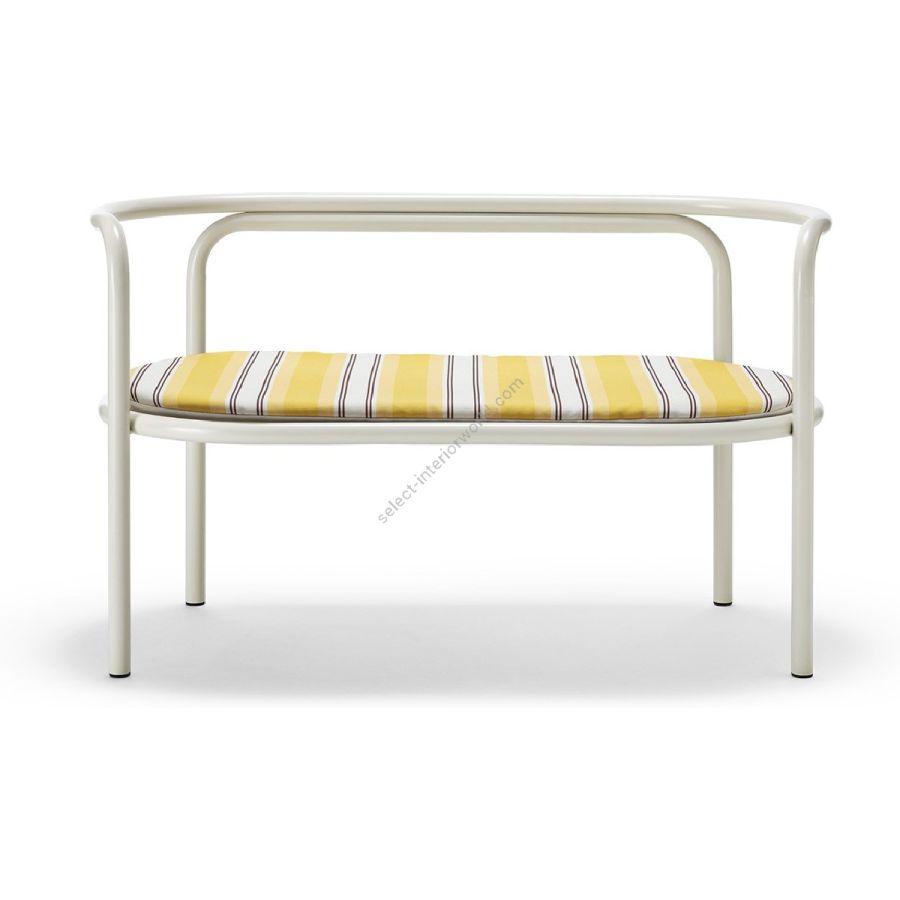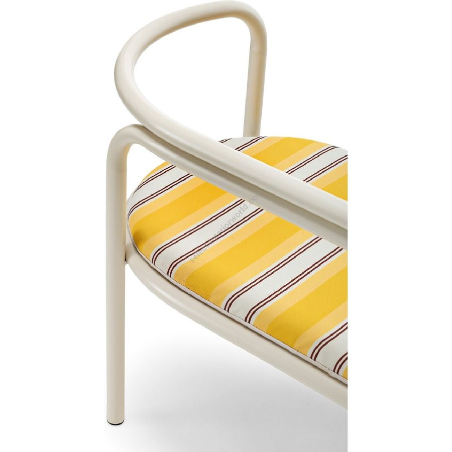 Il telaio di Locus Solus Loveseat è composto da tubolari in acciaio inossidabile verniciati. Questa capsule collection propone una struttura metallica Off-White con le sedute disponibili in due versioni: a strisce gialle o in tessuto beige con ricami fatti a mano a contrasto.