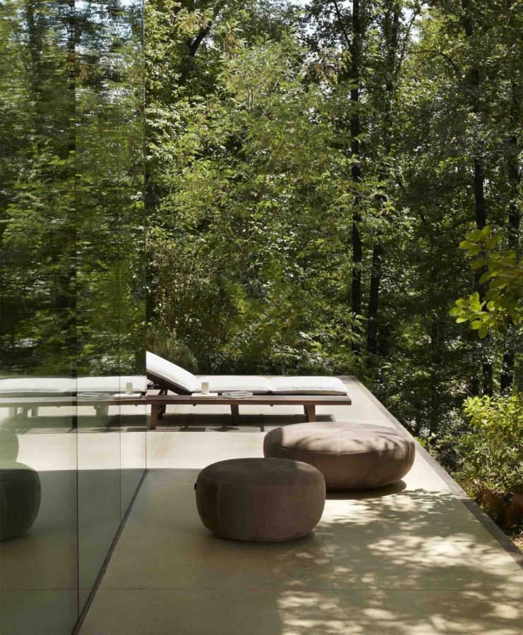 Il lettino è in mogano Sapelli ed è reso confortevole dallo schienale reclinabile, da regolare scegliendo fra tre posizioni pensate per favorire la conversazione, la lettura o il relax.