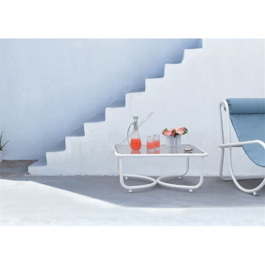 The Locus Solus Low Table, designed by Gae Aulenti in 1964, brings playful retro charm outdoors. Its tubular steel frame, visible through the glass top, creates a bold yet light design. A pop icon that combines vintage allure with contemporary elegance for shared moments.