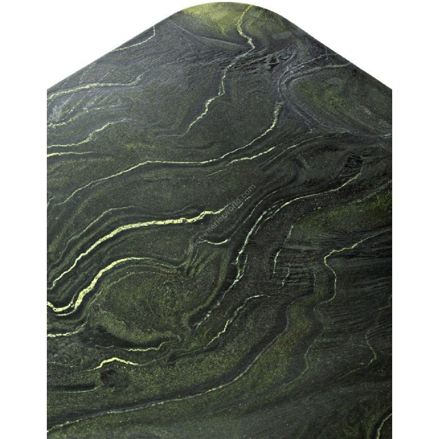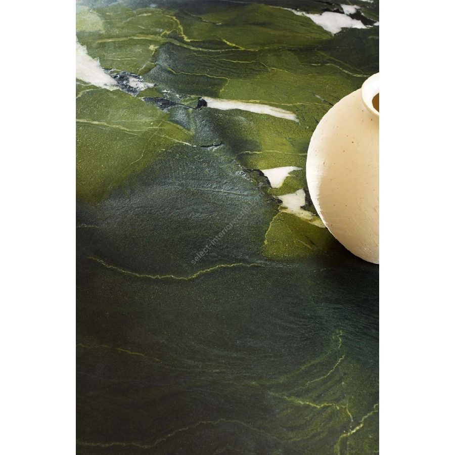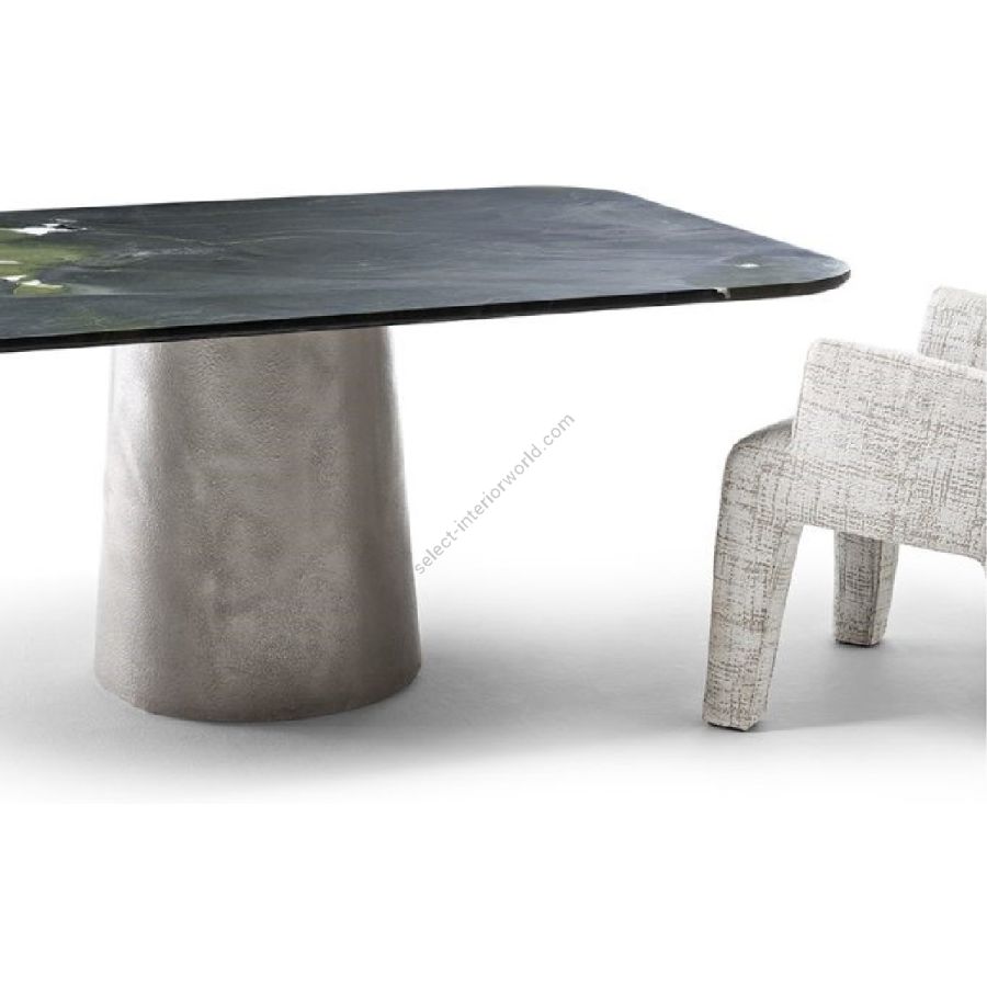 Il piano è disponibile in diverse finiture di pietre e marmi, mentre le gambe sono realizzate in un materiale innovativo, costituito per la maggior parte da polistirene espanso, che conferisce resistenza strutturale al tavolo.
