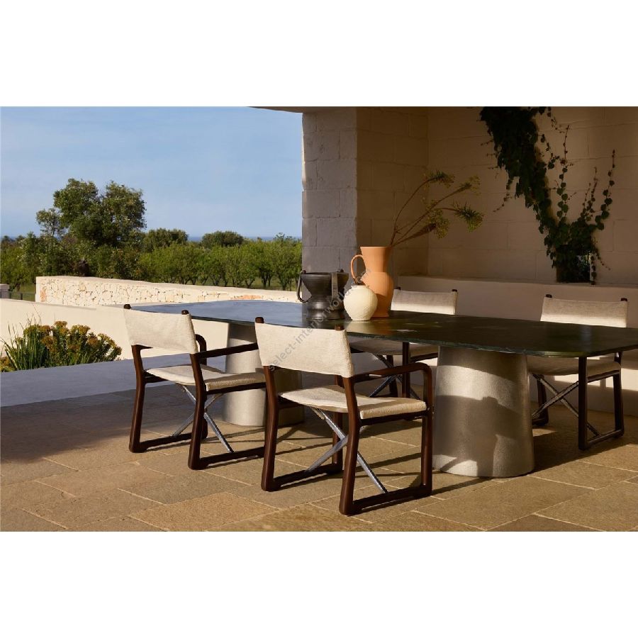 Leggerezza e monumentalità. Pietre antiche e materiali innovativi. Ispirato alle energie primordiali che si muovono sotto la superficie terrestre, questo tavolo si presta a diventare un punto di riferimento all'interno di qualsiasi zona outdoor.