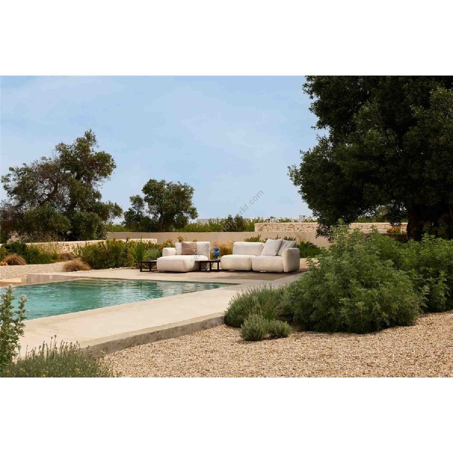 Soffice e avvolgente, questo divano modulare sfida i limiti dell'imbottito. Da un lavoro approfondito di ricerca su tecniche e materiali, nasce una nuova idea di comfort per l'outdoor, che garantisce il massimo della morbidezza e dell'impermeabiltà in qualsiasi condizione atmosferica.