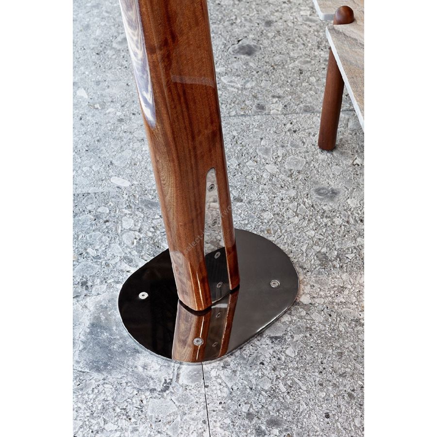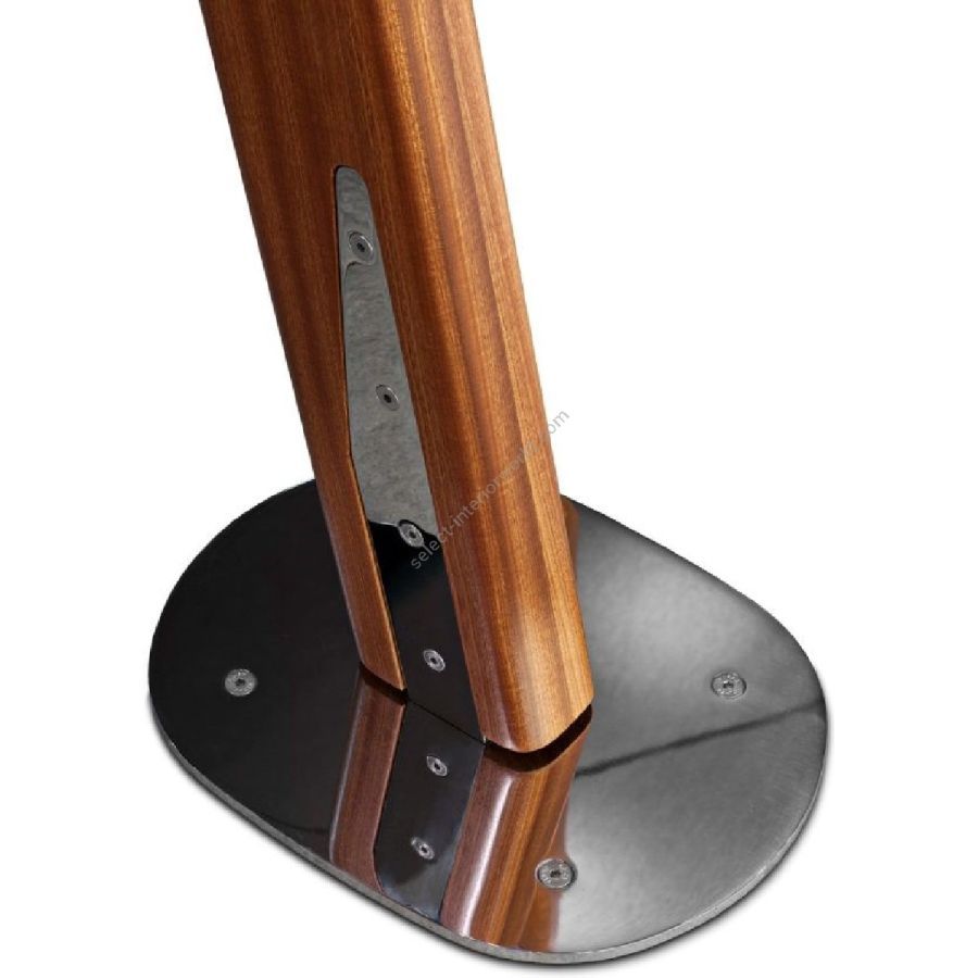 I piedistalli in acciaio inox creano riflessi di luce e conferiscono stabilità ai tralicci: un prezioso dettaglio che cattura lo sguardo in contrasto con gli elementi caldi in legno massiccio.