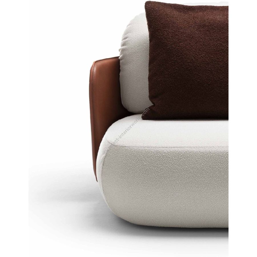 Lo schienale rigido in cuoio accoglie i volumi soffici della seduta e dei cuscini, in un abbraccio che esalta una visione giocosa e allo stesso tempo sofisticata del design.