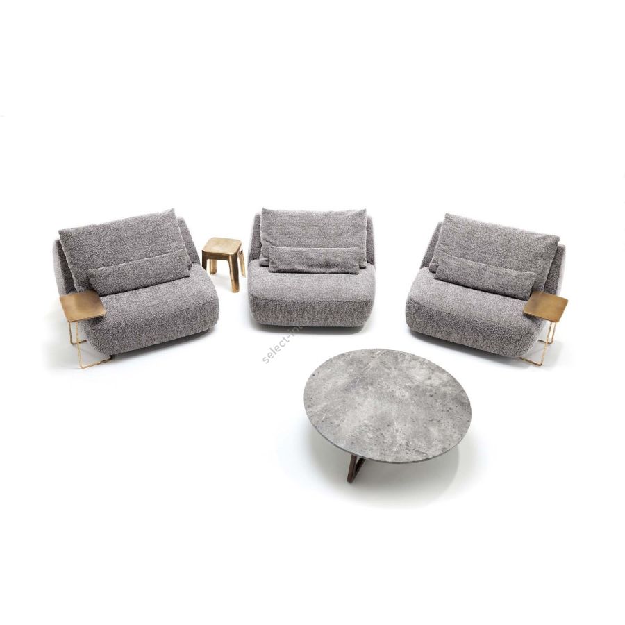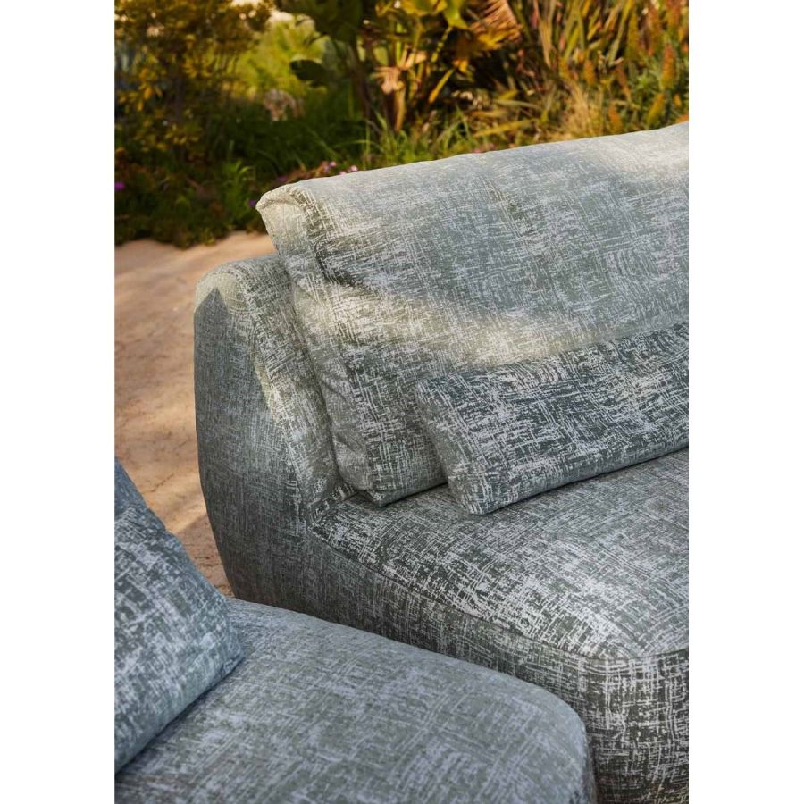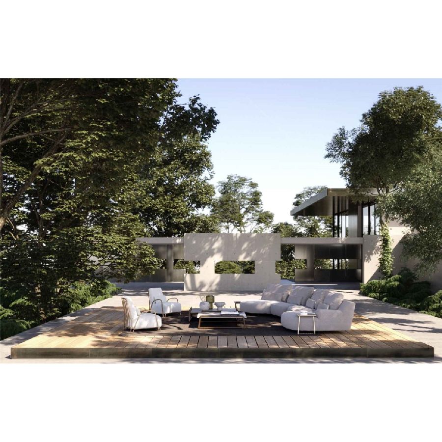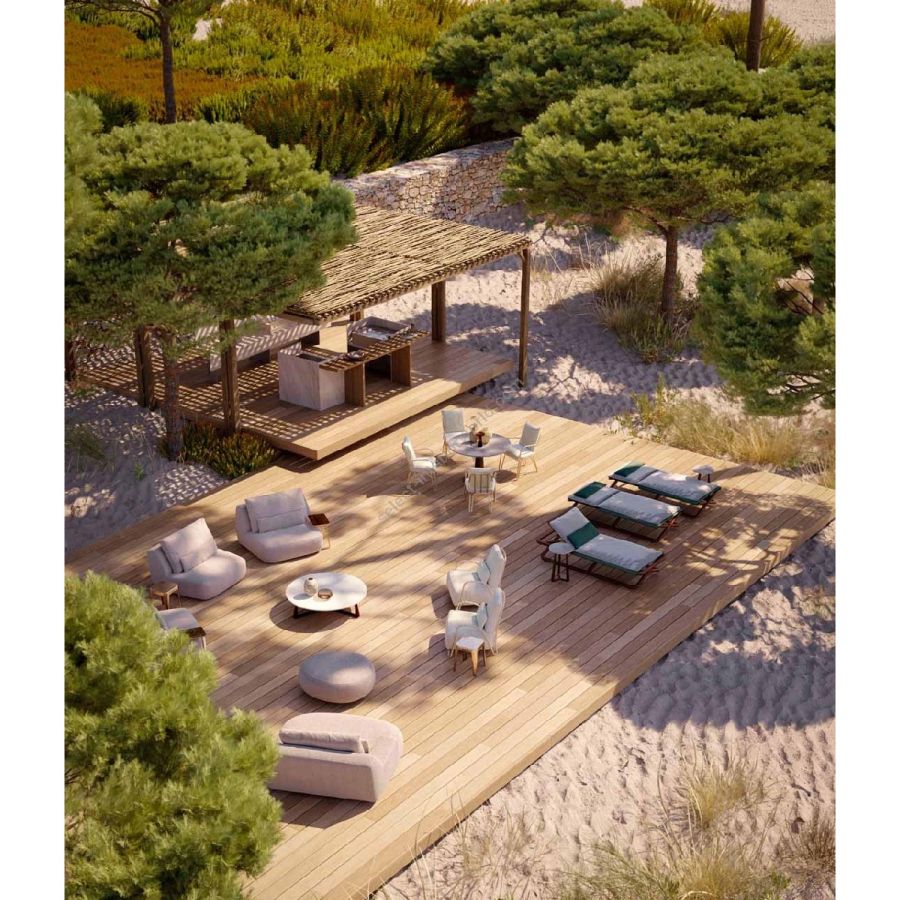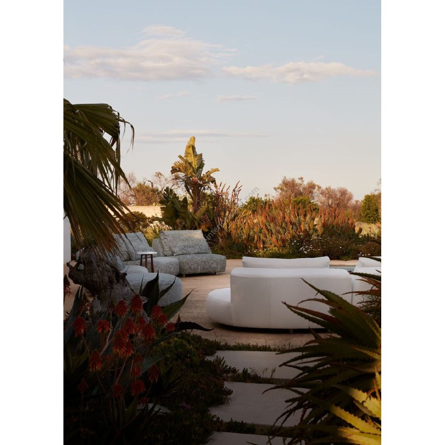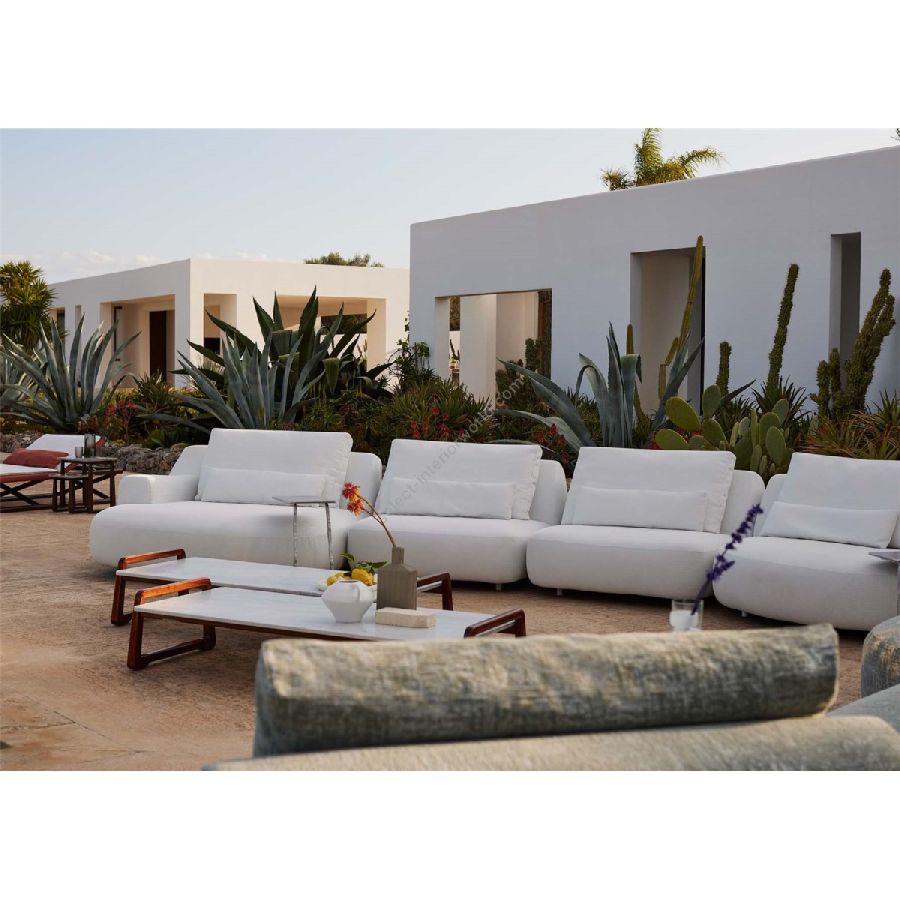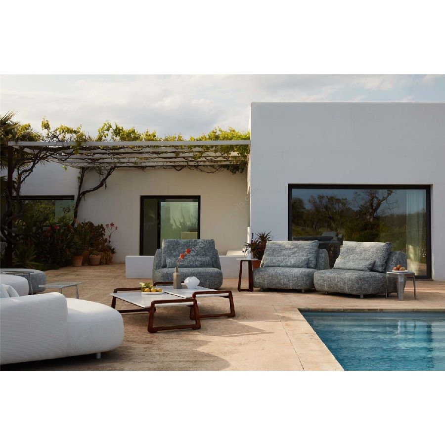 I vari moduli, con o senza bracciolo, possono vivere da soli o insieme, creando diverse composizioni. Schienale e poggiareni completano il divano, perfetto per beach club o zone living a bordo piscina.