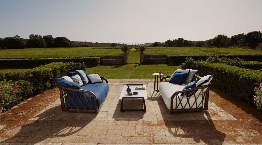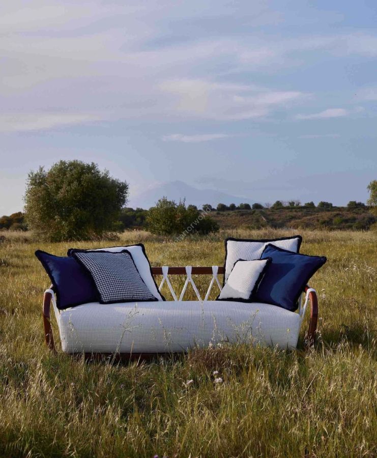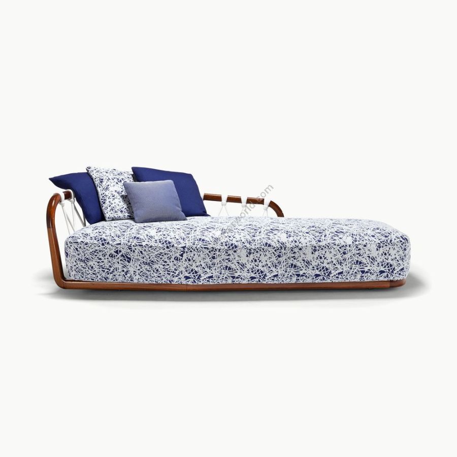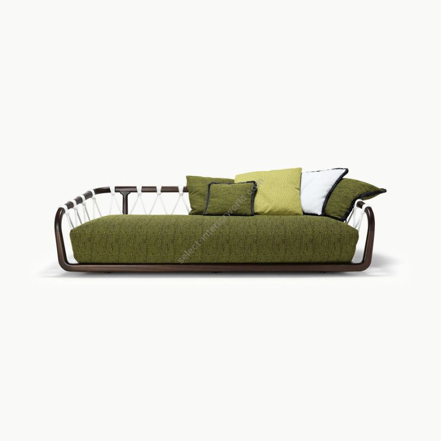 Ogni pezzo della collezione è parte di un tutto, una tessera di un mosaico che si presta a giochi infiniti di personalizzazioni ad hoc per ogni spazio. La cuscineria imbottita appoggia su un'anima solida di mogano Sapelli.