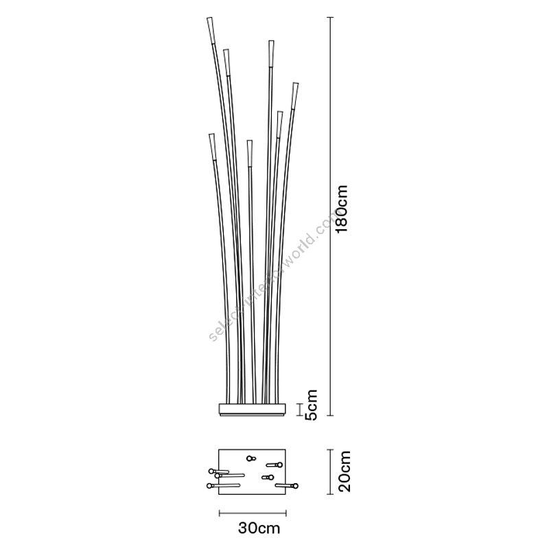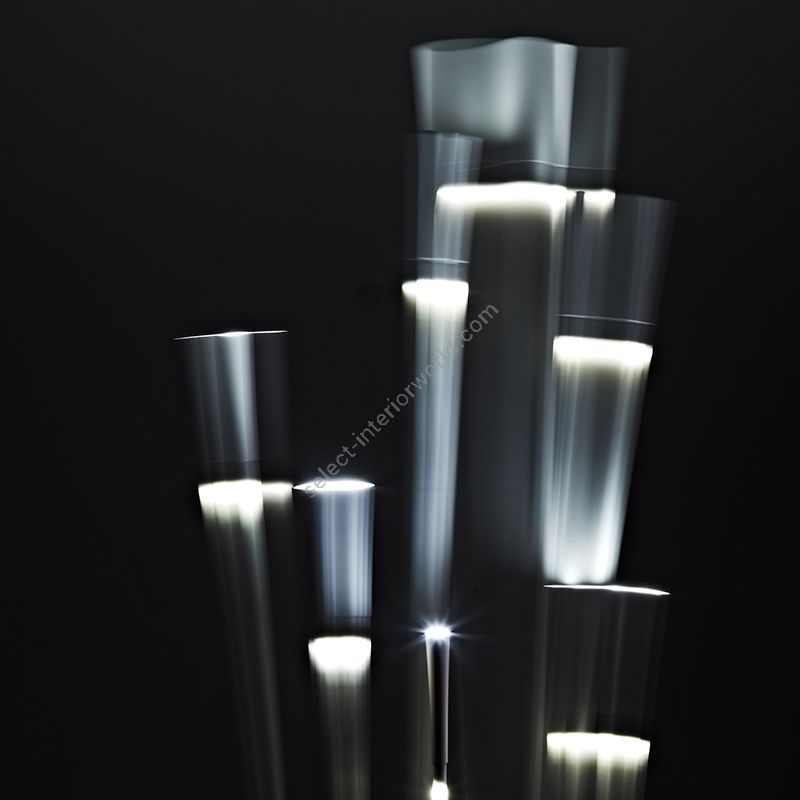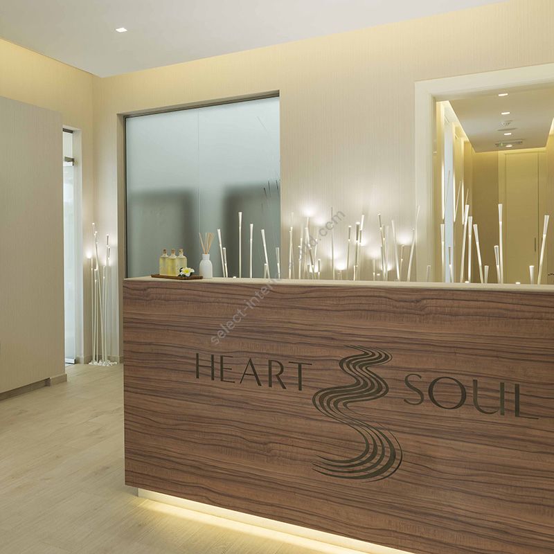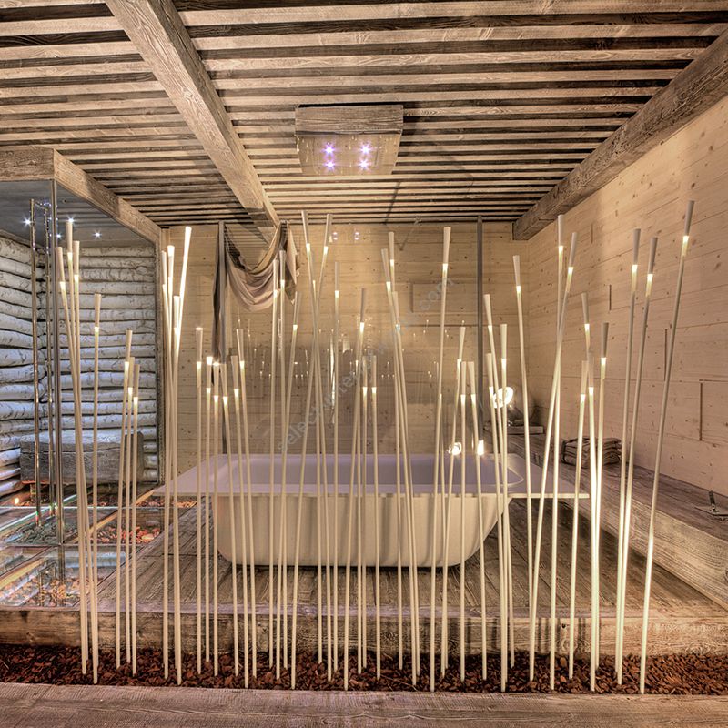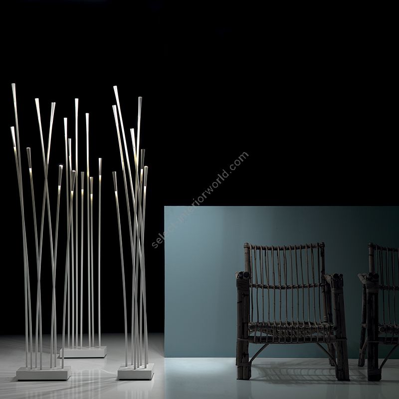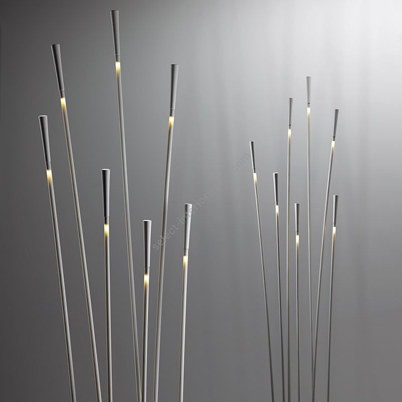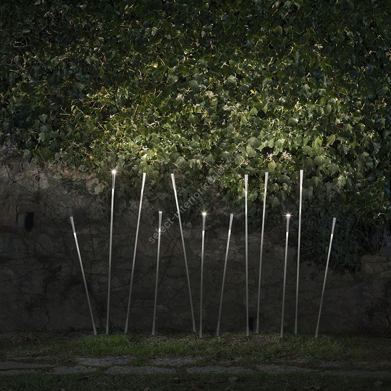 This collection is inspired by nature, the observation of the lightness and elegance of elements such as a green meadow or bull-rushes dancing in the wind. When sketching this idea, Marc Sadler conveyed the simple yet strong graphic elements which became an essential part of the design. The technical side of the project aimed at creating a final product which a modular shape. By taking inspiration from the way in which these elements are often grouped together in nature, the aim was to allow the creation, for example, of the atmosphere of an elegant Zen garden by grouping together several of the floor lamps, in the home or in the reception area of a spa centre.