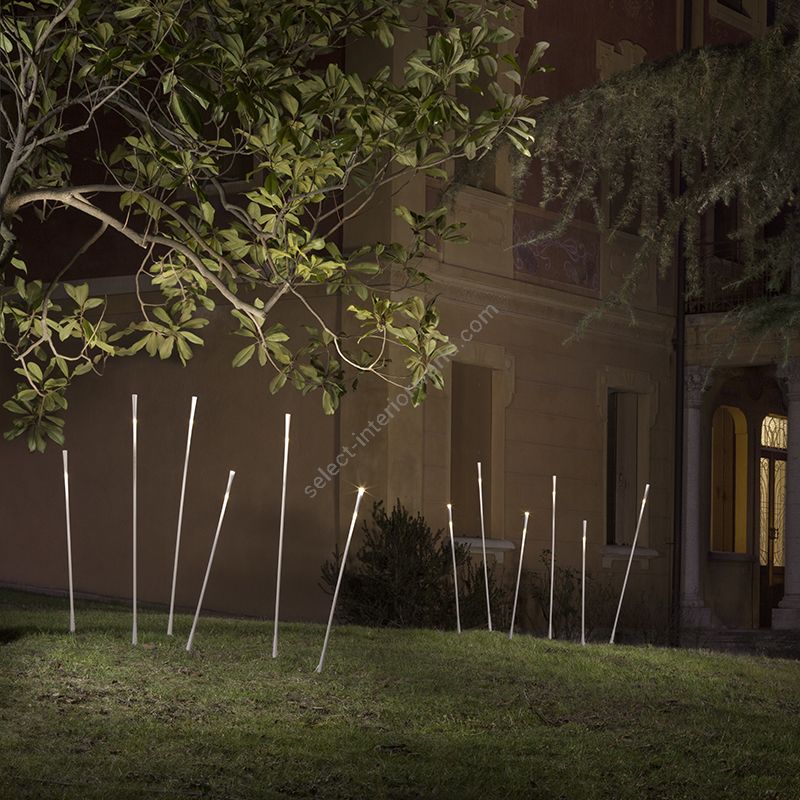 The collection is composed of three different versions of floor lamps for indoor and outdoor use. The first version includes multiple stalks that act as light diffusers, made of white plastic reinforced with fibreglass, with a light source on the tip. The metallic white base is spray-painted. The lamp runs on mains voltage with a double LED lighting system (24Vdc), fitted with a separate switch. The second version is composed of single stalks of the same material available in different heights and fitted with a metal stake for outdoor use. The last version is made out of burnished brass and copper with direct light emission.