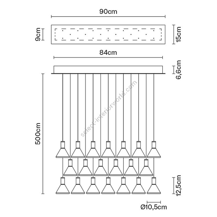 The Multispot Polair hanging lamp has clear glass diffusers with frosted base with the frames available in black or copper. The collection features a wide range of sizes and shapes of the ceiling rose with light fittings at one's pleasure. For this reason, the lamp is suitable for any environment and for custom projects.