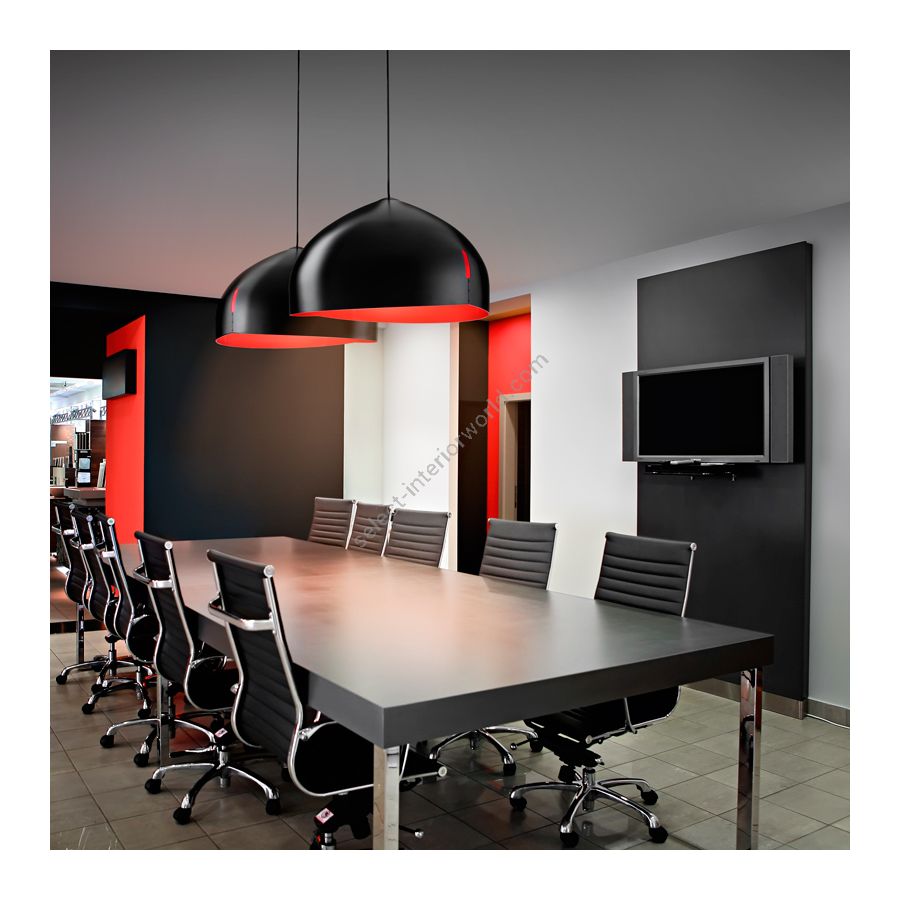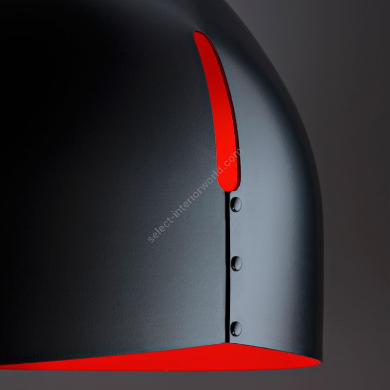 The Oru collection is made up of two types of hanging lamp for indoor use. The first, with an asymmetric shape and a particular hole, is in folded metal, painted in black on the outside and red, green and petroleum blue on the inside. The second, with its elegant, exquisite design, is a semi-spherical shade in copper, made in a single piece, burnished on the outside and polished on the inside. The lamp runs on mains power and is suitable for use with halogen, fluorescent and LED bulbs.