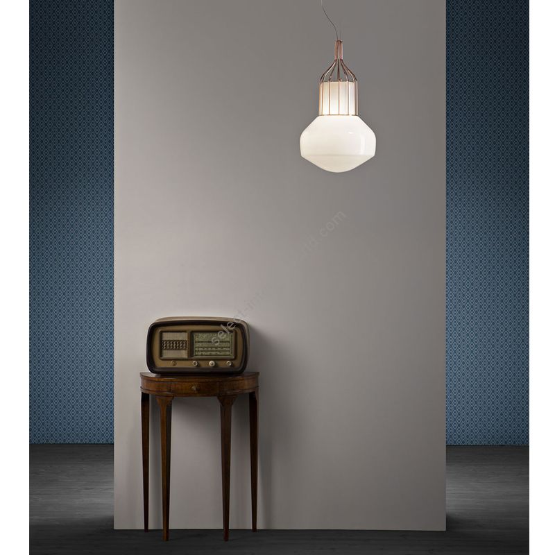 The Aérostat collection is composed of indoors hanging, table and floor lamps. Hanging and table lamps are available in two diffuser sizes with a metal cage acting as support, while the floor lamp is available in one size only. All diffusers are in shiny white blown glass whereas the metal cages are in brass, black chrome and copper finish, all shiny. Electrification on main voltage for LED bulbs.