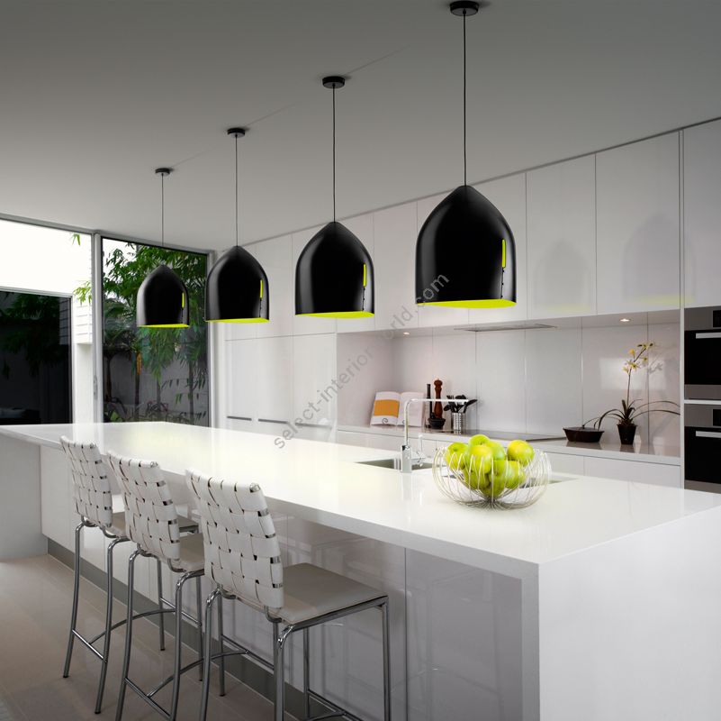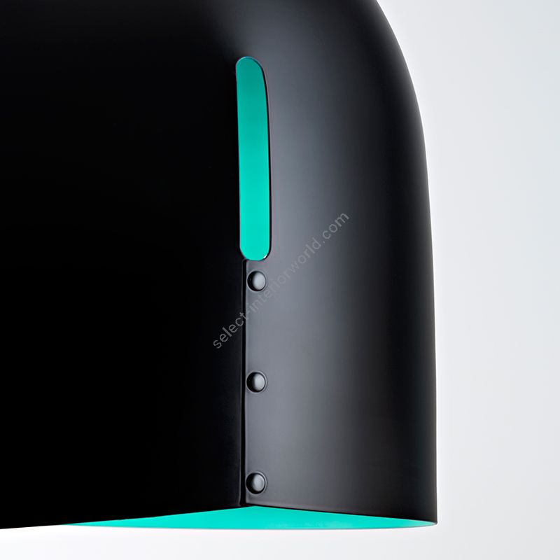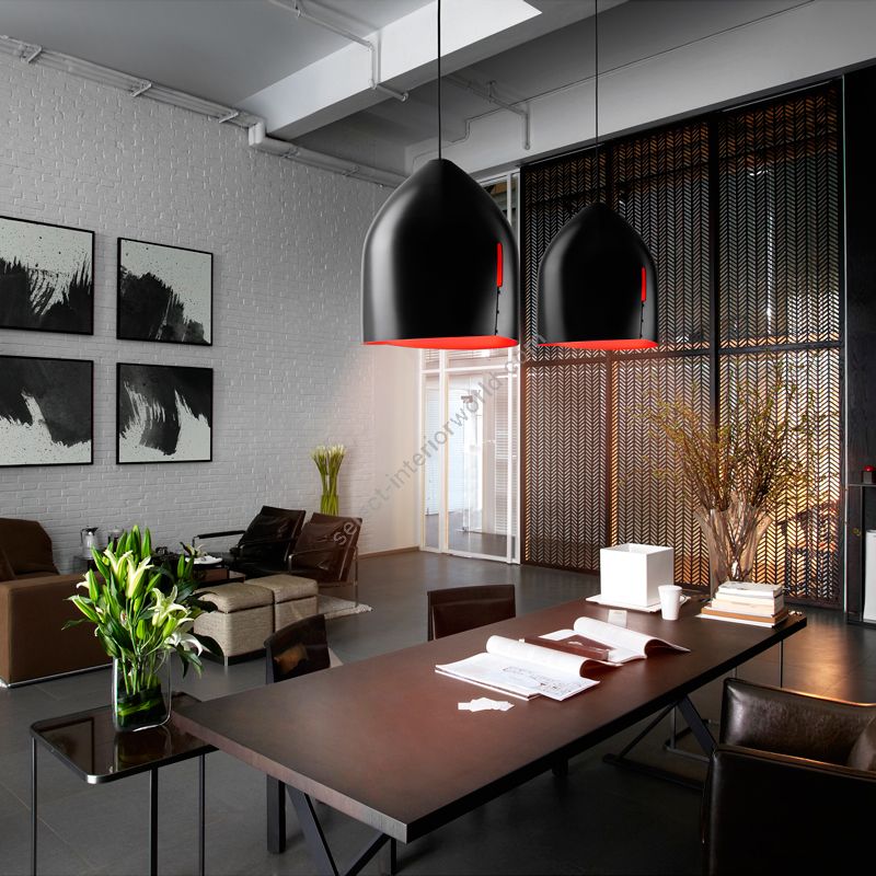 The Oru collection is made up of two types of hanging lamp for indoor use. The first, with an asymmetric shape and a particular hole, is in folded metal, painted in black on the outside and red, green and petroleum blue on the inside. The second, with its elegant, exquisite design, is a semi-spherical shade in copper, made in a single piece, burnished on the outside and polished on the inside. The lamp runs on mains power and is suitable for use with halogen, fluorescent and LED bulbs.