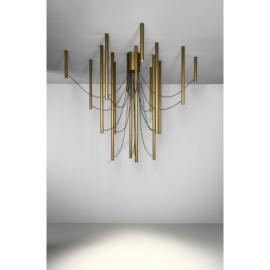 Ari è un sistema di illuminazione modulare in grado di adattarsi ai piccoli e grandi spazi, ai diversi stili ed esigenze di utilizzo. Dall’austera essenzialità della versione a singolo elemento illuminante, matrice del progetto, si può combinare fino alla versione con 16 elementi. Gli elementi, essenziali e puliti, di differenti lunghezze, si possono installare a soffitto liberamente o seguendo precisi schemi geometrici intorno al rosone centrale. È questa la massima espressione di Ari: pochi segni grafici che reinterpretano in chiave contemporanea e minimale le geometrie dei classici chandelier, riempiendo e decorando l’ambiente con volumi leggeri ed eterei. Un nuovo sistema che collega passato e presente. Un linguaggio formale e pulito che traduce e sintetizza figure tradizionali.