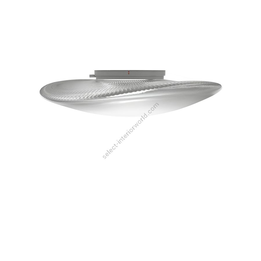 Wall/ceiling lamp with transparent blown glass diffuser, striped pattern on the top and sandblasted on the bottom. White painted metal structure.